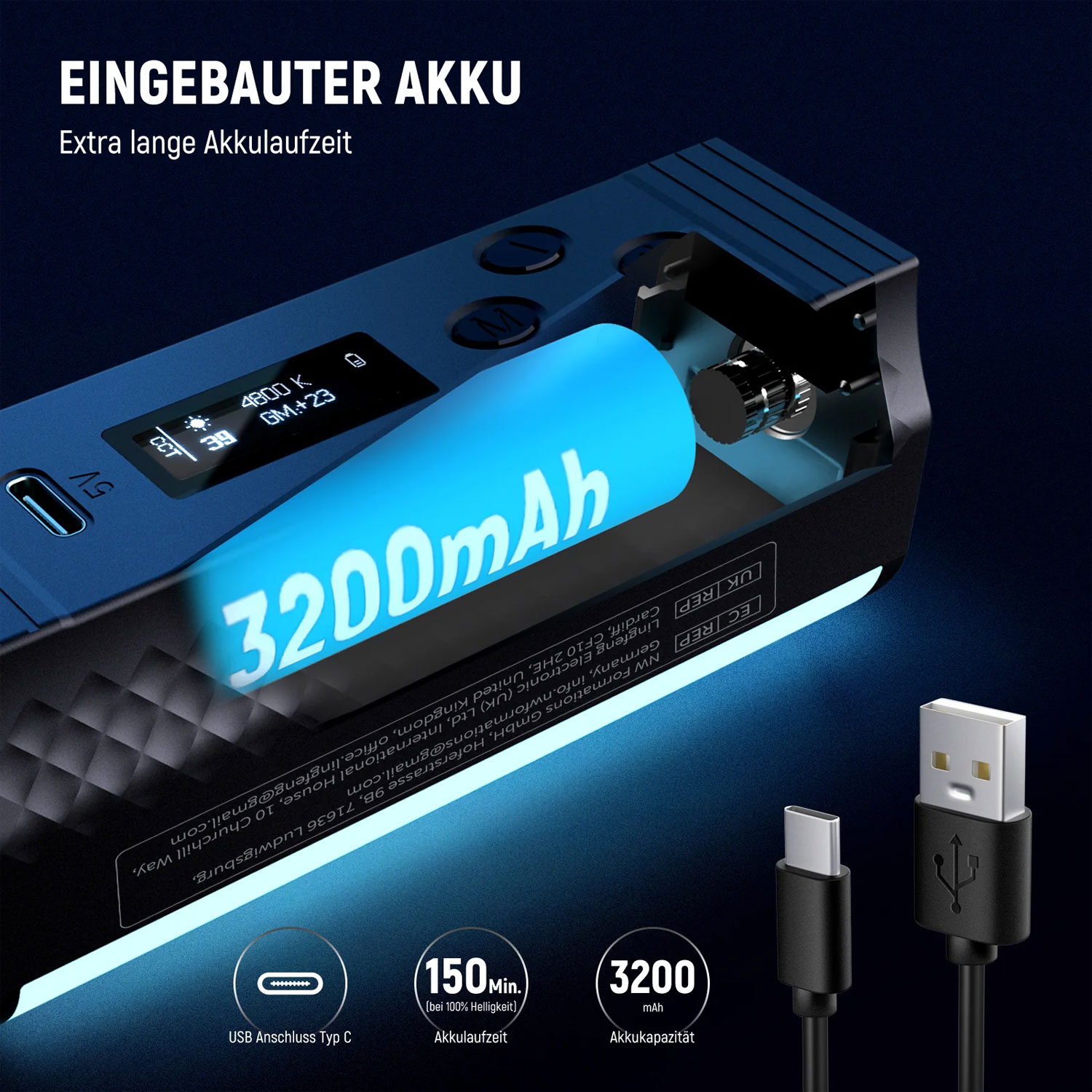 - Bis zu 150 Minuten Laufzeit (100 Prozent Helligkeit)