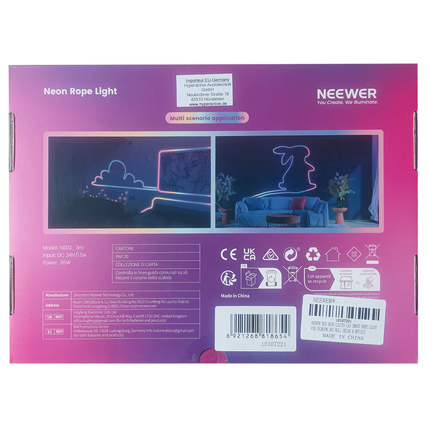 Die Installation ist denkbar einfach: Der weiche, wasserdichte Silikon-Streifen (Steuergerät und Netzteil sind nicht wasserdicht) lässt sich mühelos biegen, in die gewünschte Länge schneiden und mit dem Montagezubehör - doppelseitiges Klebeband, Clips und Schrauben - sauber und sicher in Ecken, an Wänden, Decken oder Möbeln anbringen. Das Neewer NS02 Band ist damit das ideale Werkzeug, um mit intelligentem, kreativem Licht individuelle Akzente in Ihren vier Wänden zu setzen.