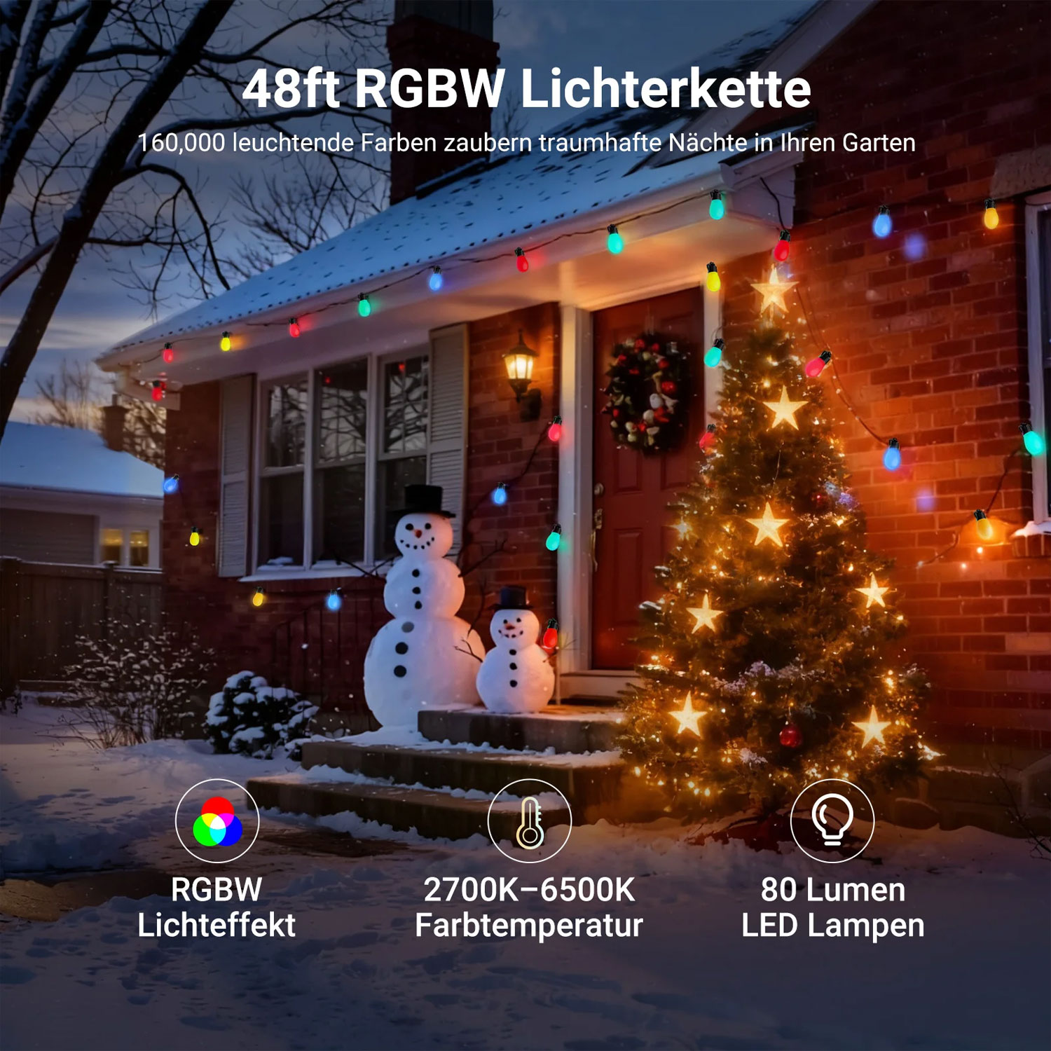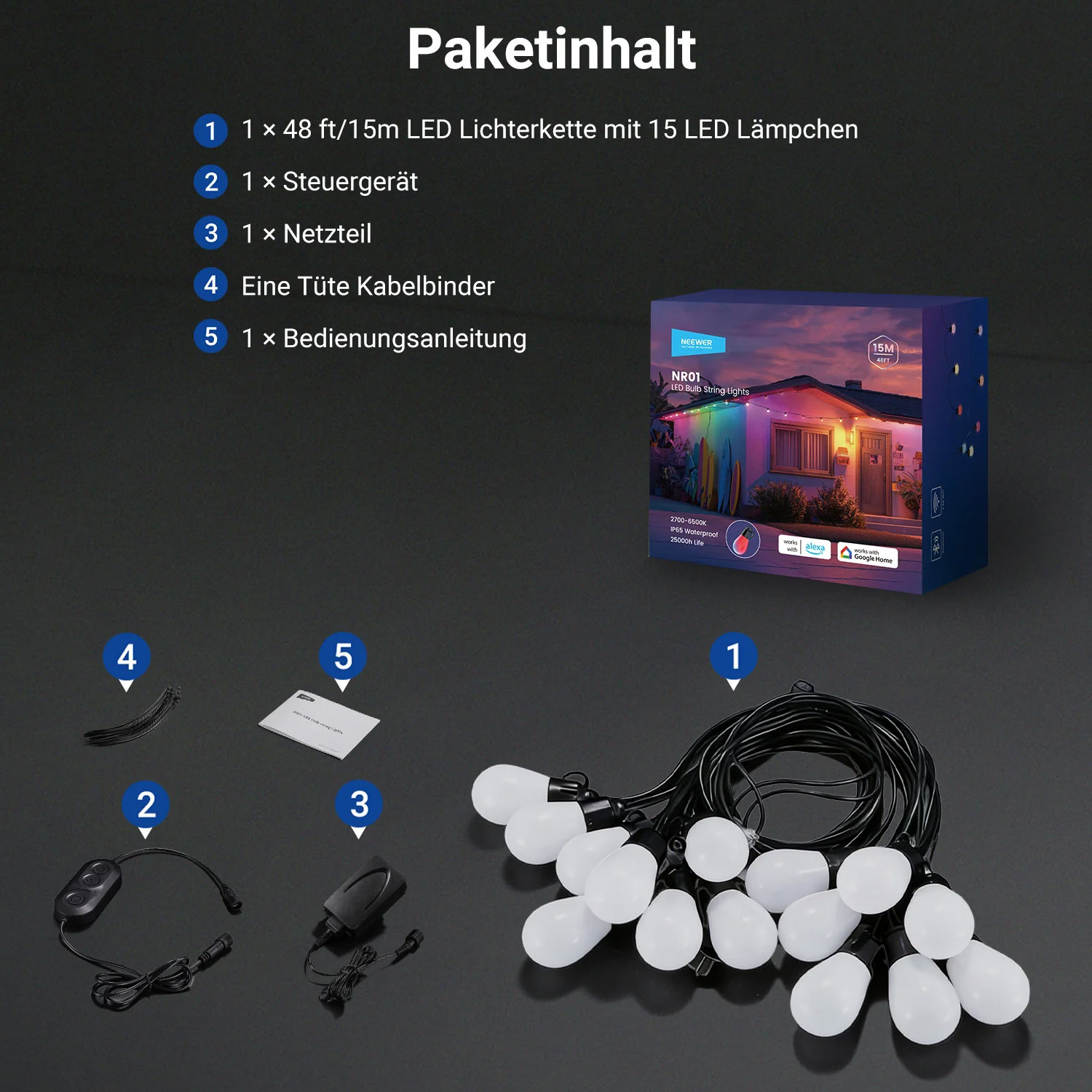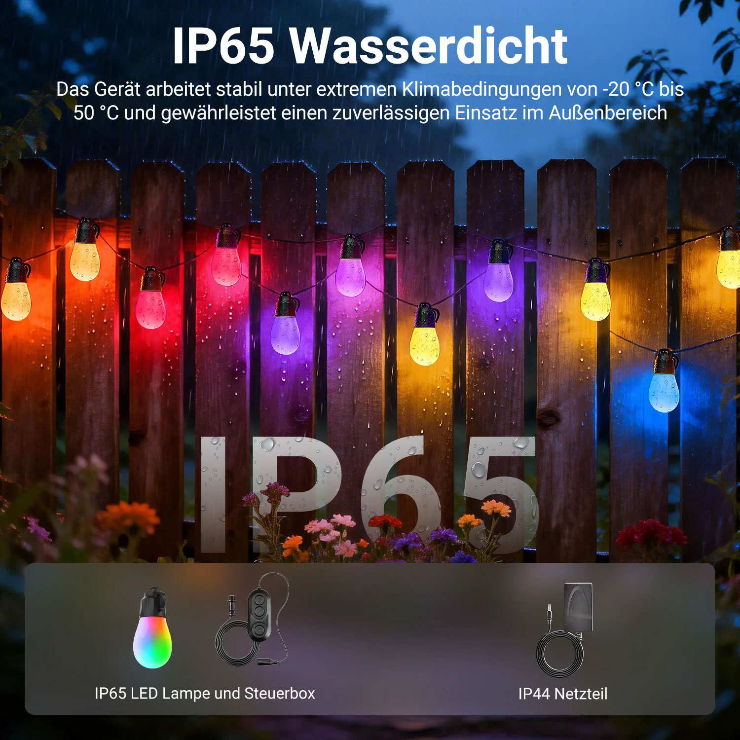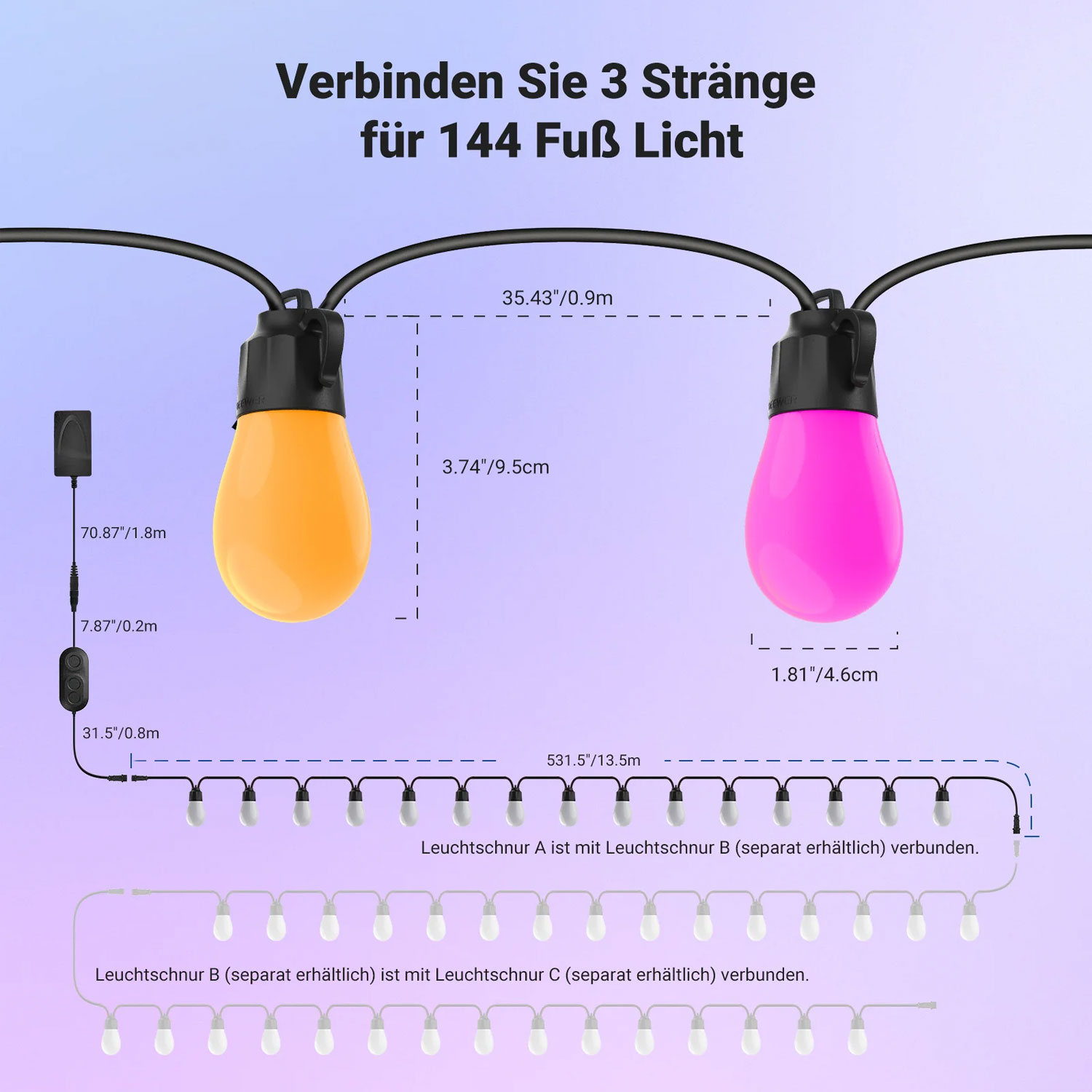 Für eine schnelle und einfache Montage ohne professionelles Werkzeug verfügt die Lichterkette sowohl über Aufhängelöcher als auch über Haken, und die Glühbirnen lassen sich mit den mitgelieferten Kabelbindern durch die Löcher befestigen, um ein Verrutschen zu verhindern. Du kannst bis zu drei Lichterketten (insgesamt 45 Meter) miteinander verbinden.