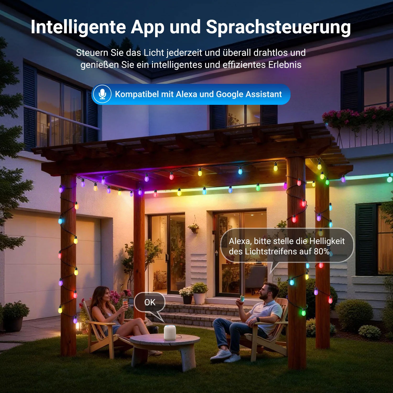 Darüber hinaus sind die intelligenten LED-Außenlichterketten mit Smart Devices durch einfache Sprachbefehle steuerbar - bitte beachte, dass die Kompatibilität nur mit 2,4GHz WLAN-Routern oder mobilen Hotspots gegeben ist, während 5GHz Netzwerke nicht unterstützt werden.