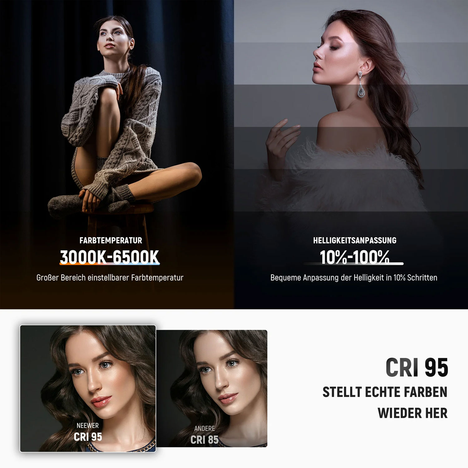 Die volle Kontrolle über Ihre Lichtatmosphäre erhalten Sie durch den stufenlos verstellbaren Farbtemperaturbereich von 3000 K (warmes, gemütliches Licht) bis 6500 K (kühles, tageslichtweißes Licht). Zusätzlich lässt sich die Helligkeit in 10 Stufen von 10 Prozent bis 100 Prozent dimmen, um sich flexibel an jede Tageszeit und Umgebungshelligkeit anzupassen. Ein herausragender Farbwiedergabeindex (CRI) von 95 stellt sicher, dass Hauttöne und Farben in Ihrem Bild natürlich, lebendig und originalgetreu wiedergegeben werden - essenziell für anspruchsvolle Videoaufnahmen und Streaming.