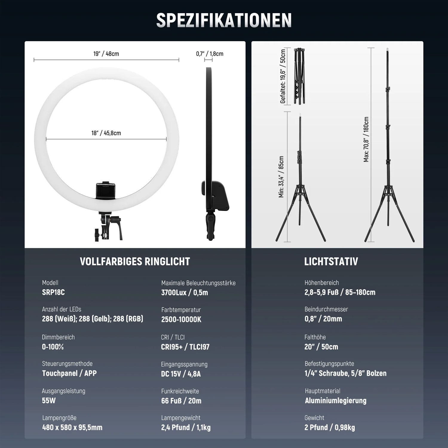 18-Zoll-RGB-LED-Ringlicht, das neue Maßstäbe in Sachen Vielseitigkeit und Bedienkomfort setzt. Dieses intelligente Ringlicht kombiniert eine beeindruckende