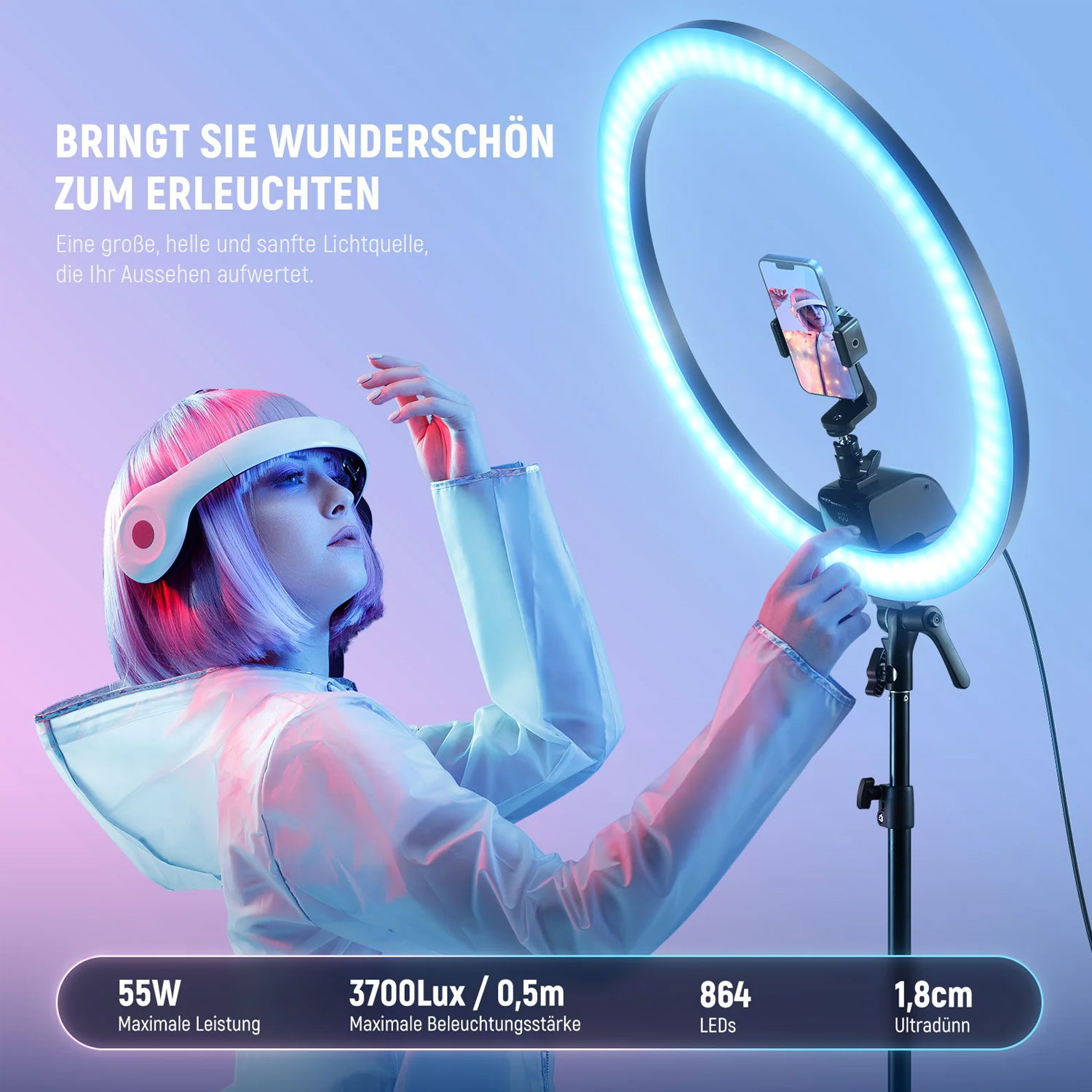 18-Zoll-RGB-LED-Ringlicht, das neue Maßstäbe in Sachen Vielseitigkeit und Bedienkomfort setzt. Dieses intelligente Ringlicht kombiniert eine beeindruckende