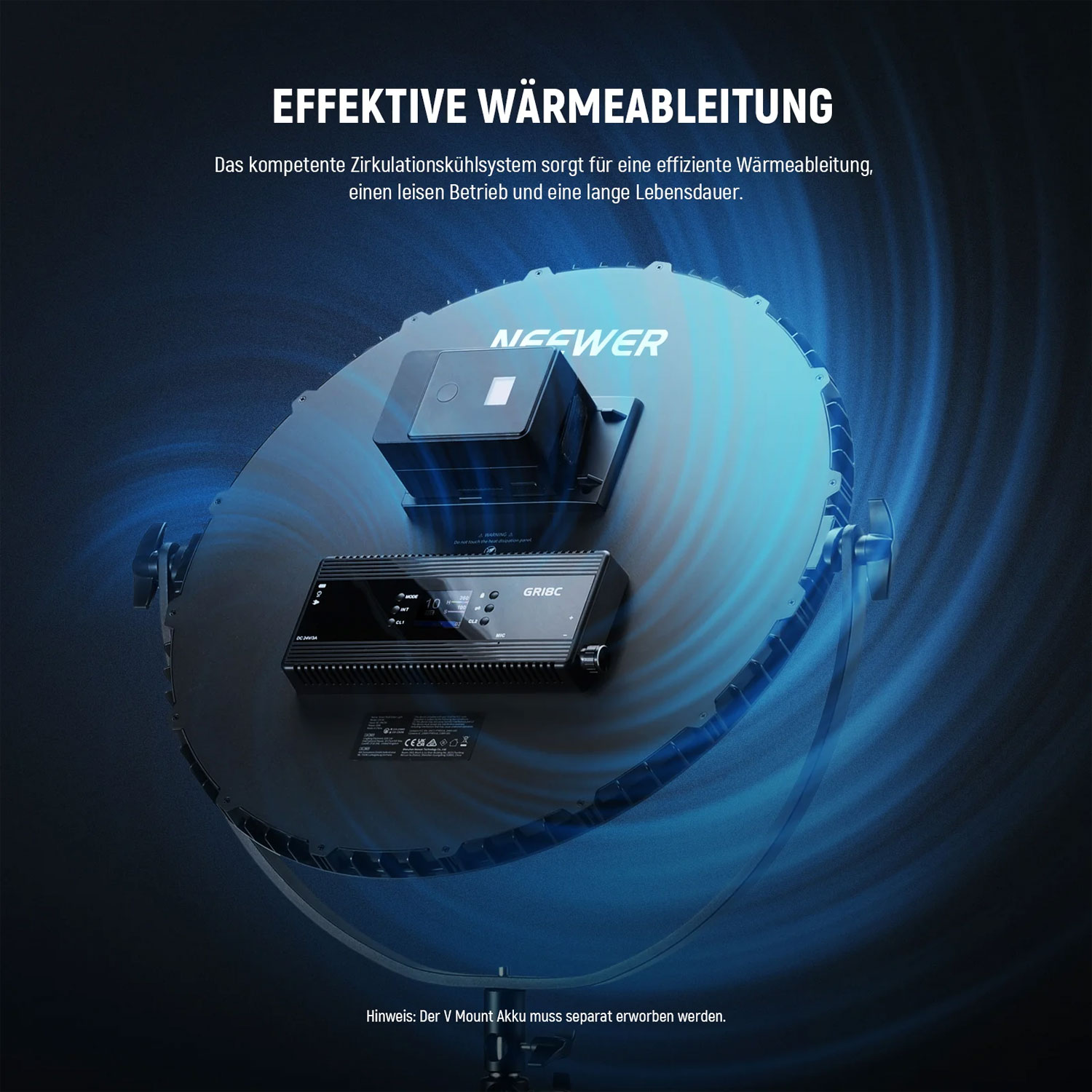 Neben dem im Lieferumfang enthaltenen 24V-Netzadapter mit EU-Stecker ist die Leuchte mit einer V-Mount-Platte kompatibel und kann mit entsprechenden Akkus für mobile Einsätze im Außenbereich betrieben werden – ideal für unterbrechungsfreie Drehs.