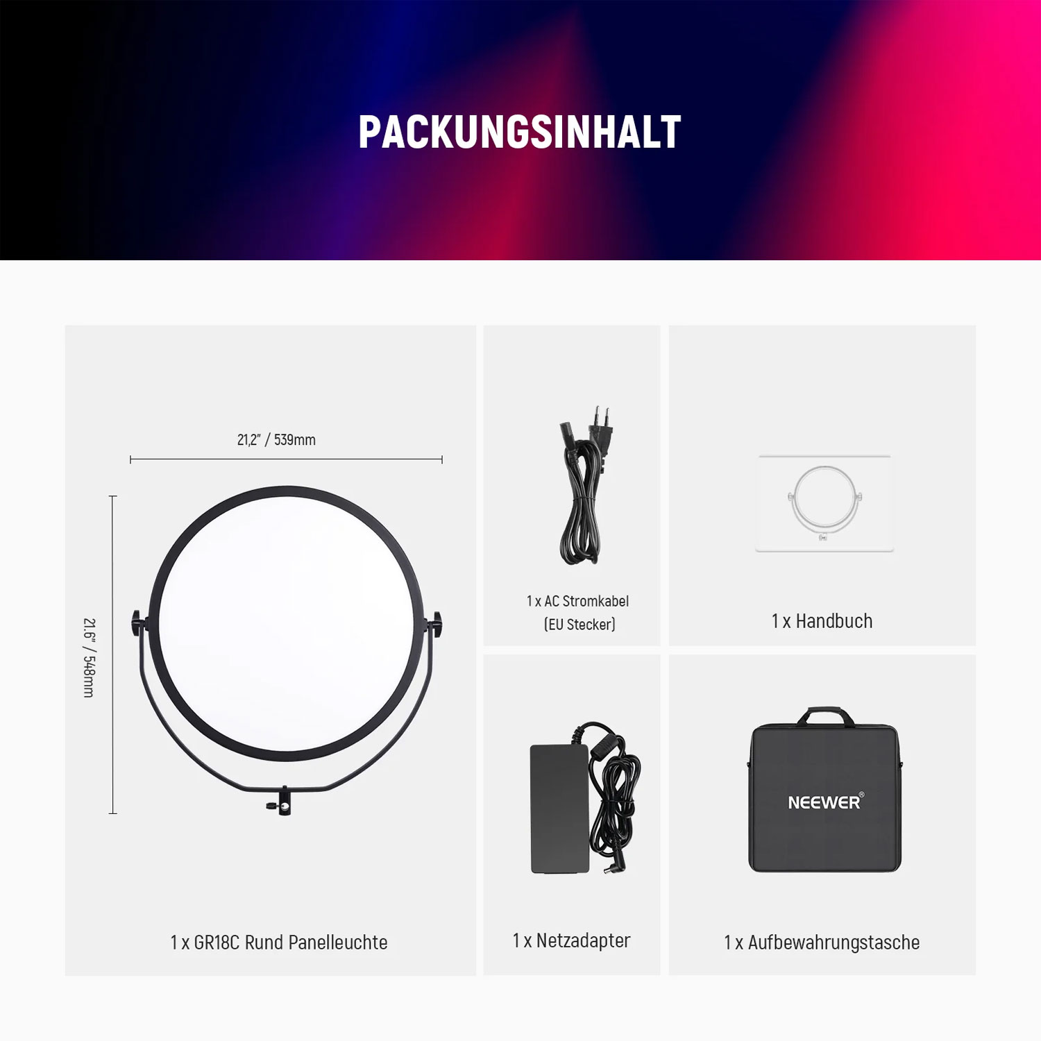 Das Neewer GR18C RGB LED Panel setzt neue Maßstäbe in der Welt der Videobeleuchtung und vereint professionelle Leistung mit bemerkenswerter Vielseitigkeit. Mit seinem großzügigen 18-Zoll-Durchmesser und einer schlanken Bauweise von nur 2,3 cm profiliert sich diese runde Fülllicht-Lampe als ideale Lösung für anspruchsvolle Aufnahmen jeglicher Art. Die innovative Kantenbeleuchtungstechnologie garantiert eine gleichmäßige, blendfreie 360-Grad-Beleuchtung mit einer beeindruckenden maximalen Beleuchtungsstärke von 6000 Lux bei 0,5 Metern – perfekt für die Ausleuchtung von Gesichtern ohne unerwünschte Schatten oder harte Kontraste.