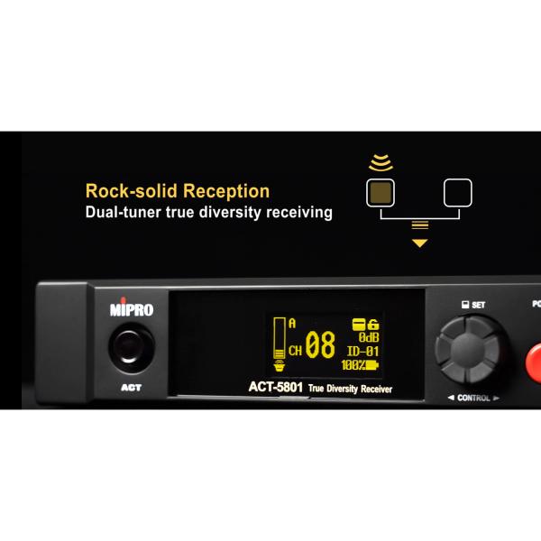 Der Mipro ACT-5801 ist ein digitaler 1-Kanal-Empfänger im anmeldefreien Frequenzbereich von 5,725 - 5,850 GHz.