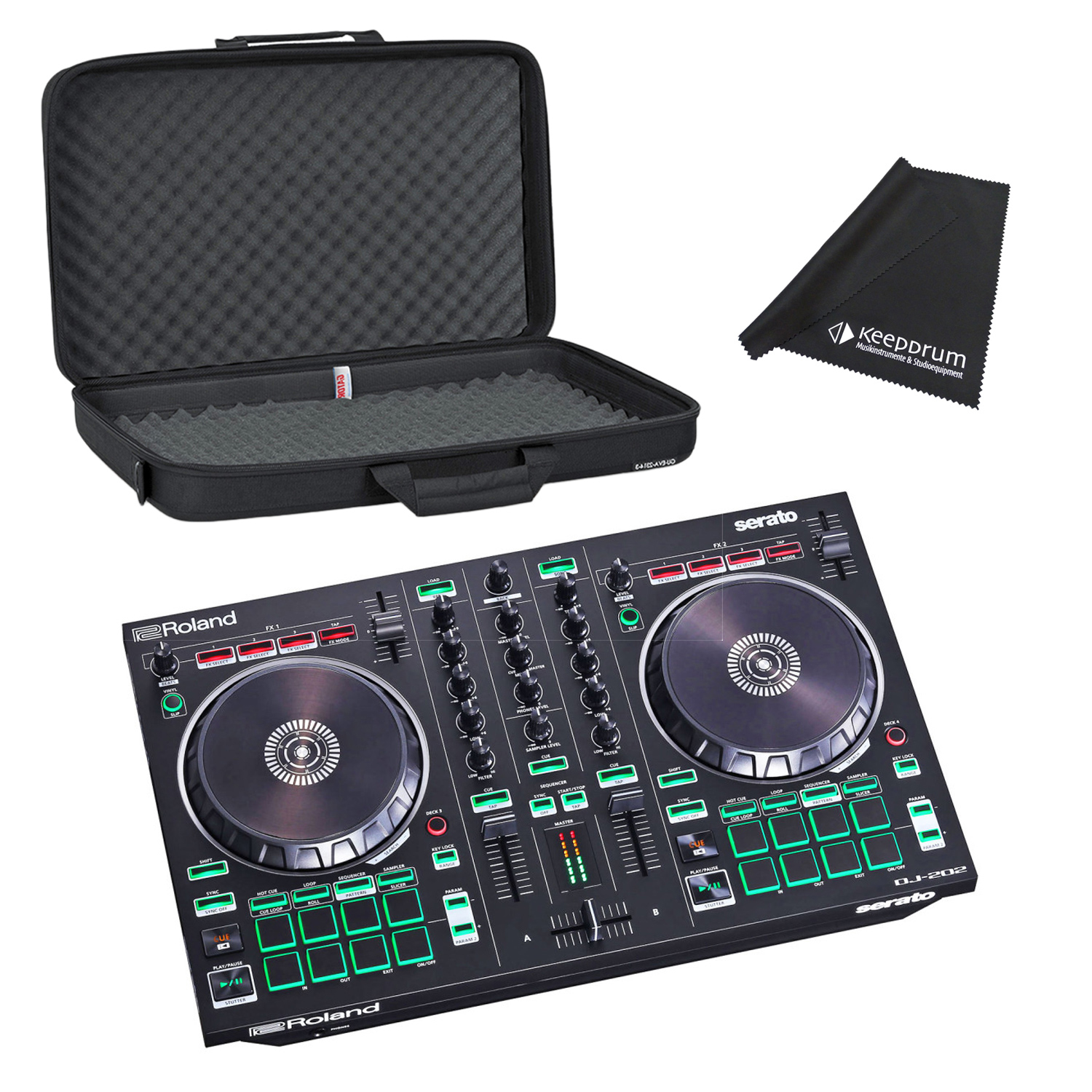 Der DJ-202 von Roland ist ein DJ Controller mit zwei Kanälen und vier Decks. Der kompakte Controller lässt sich schnell einrichten und dank der Tragegriffe gut transportieren. Durch den hochauflösenden DA-Wandler bietet der DJ-202 mit 24bit/48kHz eine hervorragende Klangqualität.