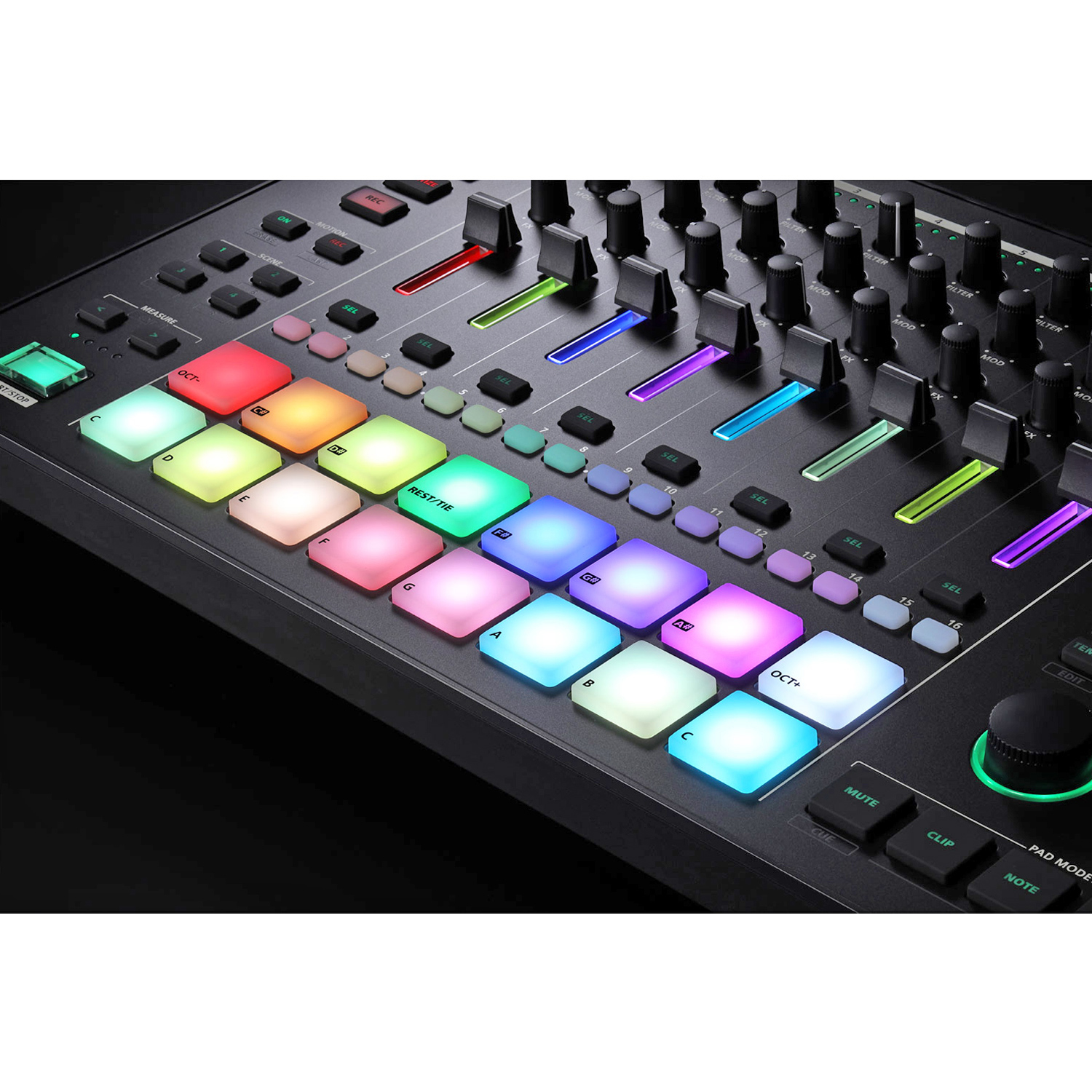Der 8-Spur Sequenzer wurde für reibungslose Produktionen optimiert. Mit dem TR-REC Step-Sequenzer können Parts aus den klassischen Roland Drum Machines erstellt werden. Mithilfe der 16 anschlagsempfindlichen Pads können Drum-Parts, melodische Basslines und polyphone Akkord-Progressionen gespielt und aufgenommen werden. Weitere Tools wie Note Repeat, Chord Designer und Step LFO lassen der Kreativität freien Lauf.