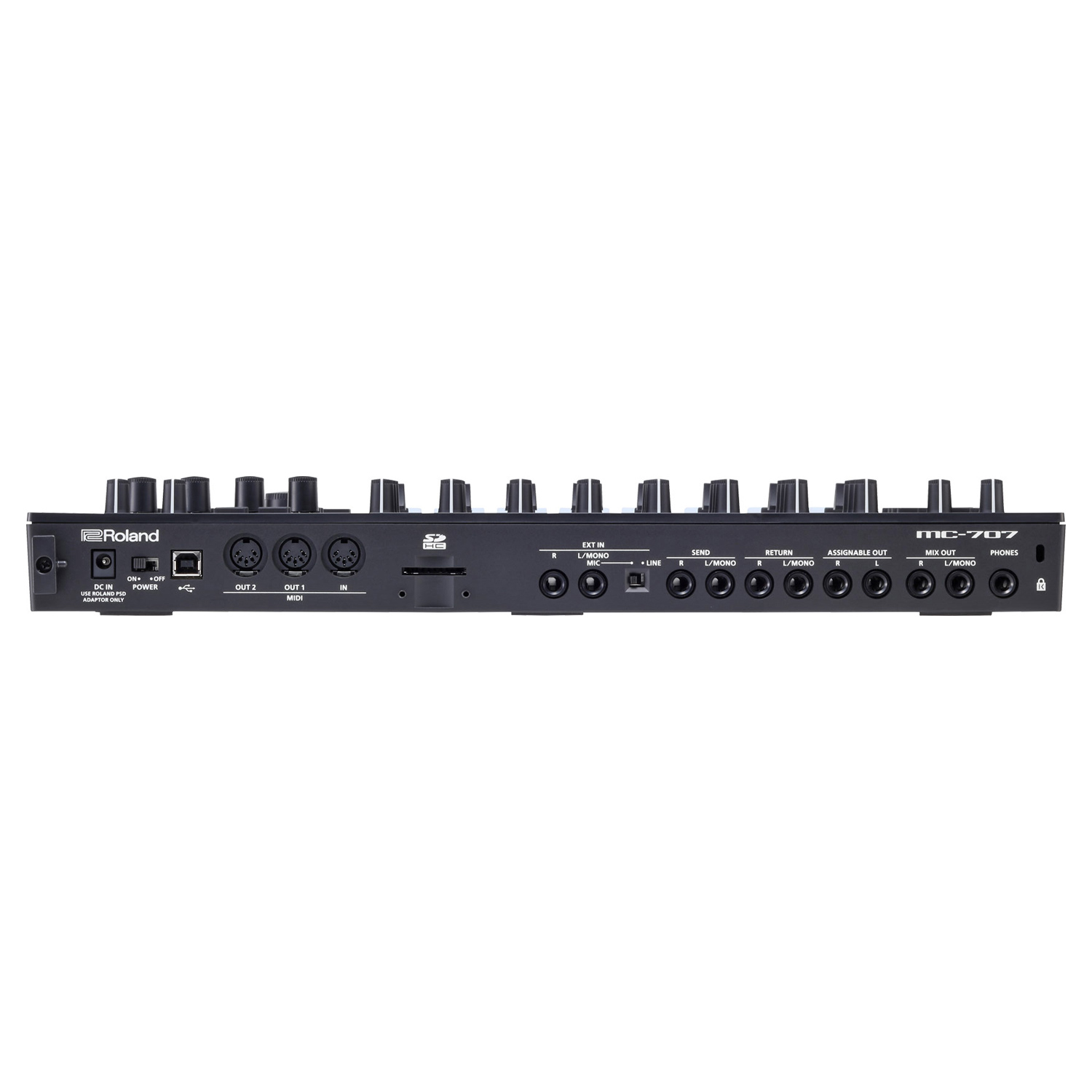 Die MC-707 hat ein integriertes USB Audio-Interface und lässt sich einfach in ein vorhandenes Produktions-Setup einfügen. Die Einzelspuren können in einer Software aufgezeichnet und dort weiterbearbeitet werden. Anschlüsse: