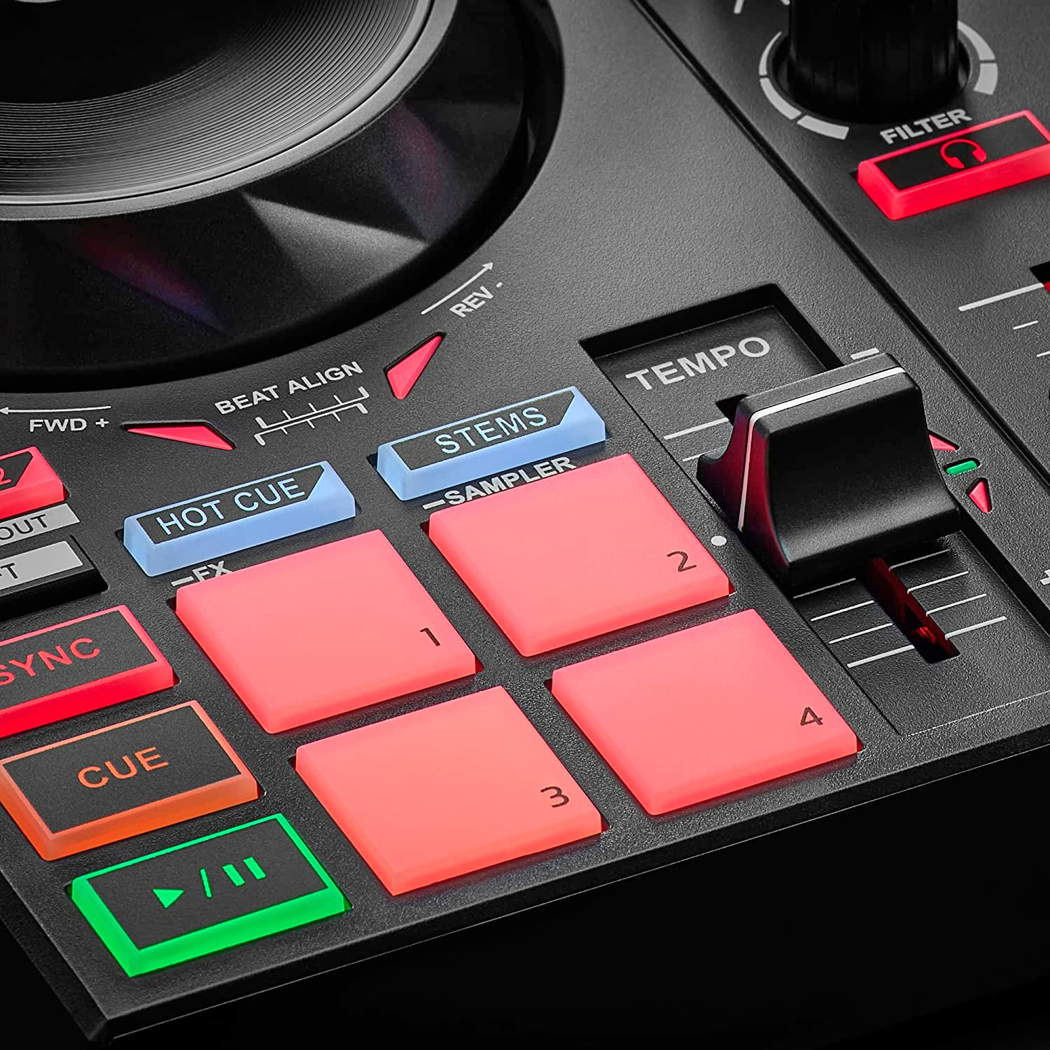Der 2-Deck Controller bietet zwei 90mm Jogwheels mit Vinyl-Feeling durch Druckerkennung zum Scratchen und für Beatmatching. Dazu kommen pro Deck je 4 Pads mit den 4 Modi Hot-Cue, Stems, FX sowie Sampler.