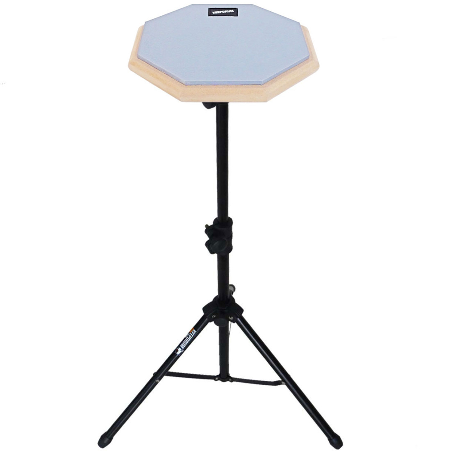 Das Practice-Pad ist 8 Zoll groß und verfügt an der Rückseite über eine dämpfende Schaumstofffläche die es ermöglicht das Pad zum Üben auf einem Tisch oder einer anderen Oberfläche zu verwenden ohne ein Stativ zu benötigen. Ebenso ist es möglich das Übungspad durch das 8mm Gewinde auf der Rückseite des Pads auf ein Stativ zu montieren.