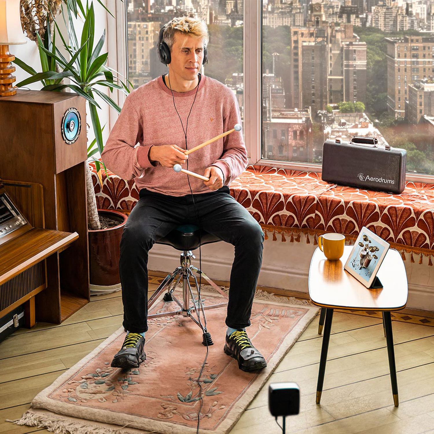 Im Gegensatz zu einem herkömmlichen Schlagzeug benötigt Aerodrums 2 kaum Platz und kann sogar bequem im Schlafzimmer genutzt werden. Genieße das Spielen, ohne dir Gedanken über den Aufbau oder störende Geräusche machen zu müssen. Denn Aerodrums 2 selbst ist vollkommen lautlos. Du spielst so laut du willst, aber nur für deine Ohren – über Kopfhörer oder Lautsprecher.