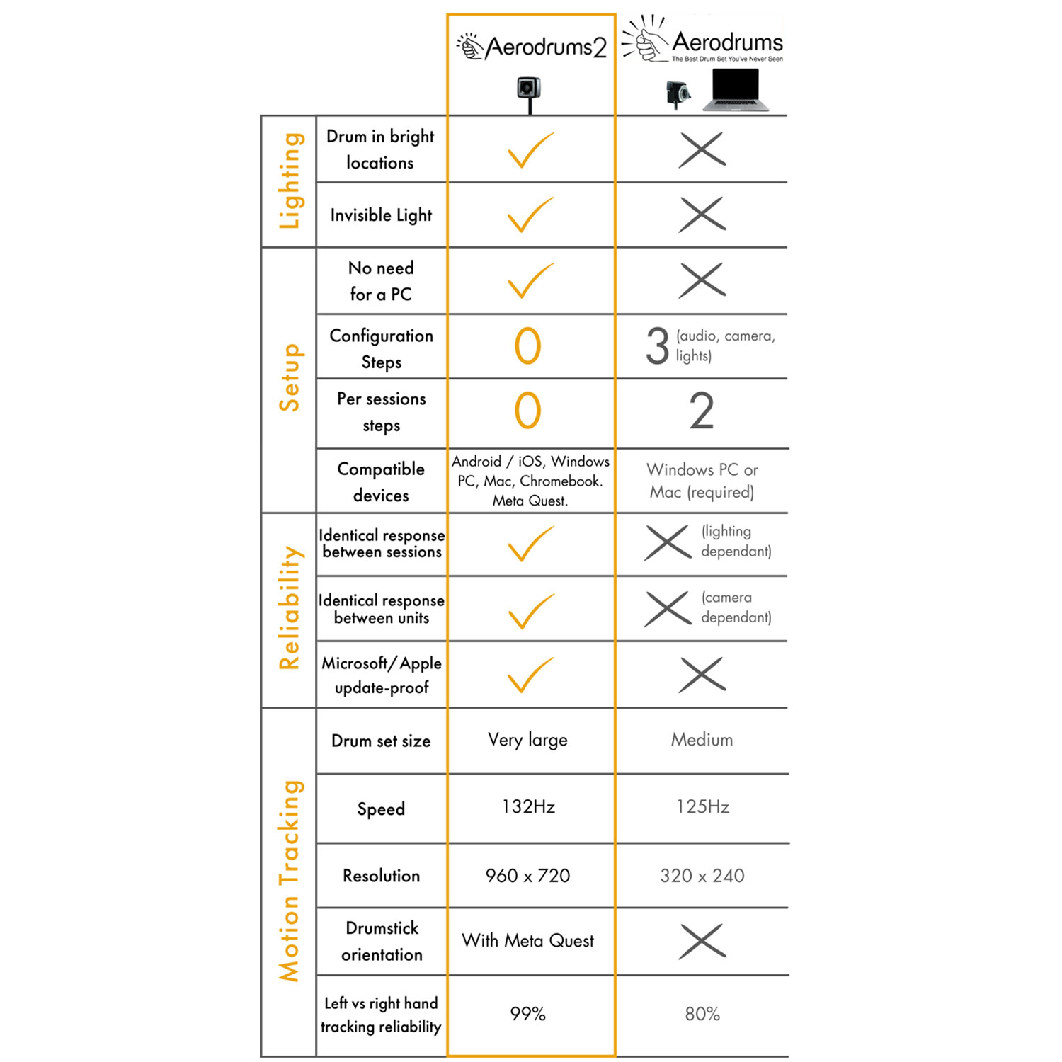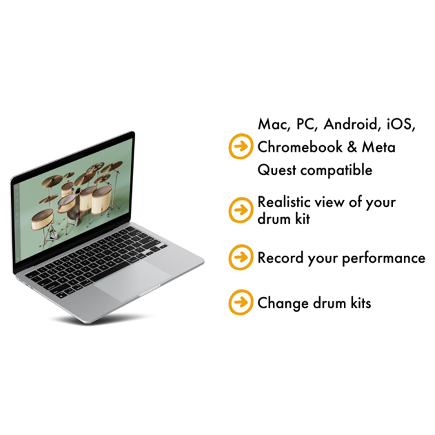 Die Aerodums App ist für Windows-PCs, Macs, Android, iOS, Chromebooks und Meta Quest verfügbar und bietet eine beeindruckende, realistische Darstellung eines Schlagzeugs, der Sticks und Füße. Es kann nicht nur aus einer Vielzahl von Schlagzeugsets gewählt werden, sondern auch mit einem fortschrittlichen Metronom geübt und eigene Performances aufgenommen werden. Aerodrums 2 unterstützt Meta Quest VR-Headsets womit man seine reale Umgebung und Hände beim Schlagzeugspielen sieht. Schlagzeug und Sticks werden präzise in Echtzeit eingeblendet, was das Schlagzeugerlebnis noch immersiver macht.
