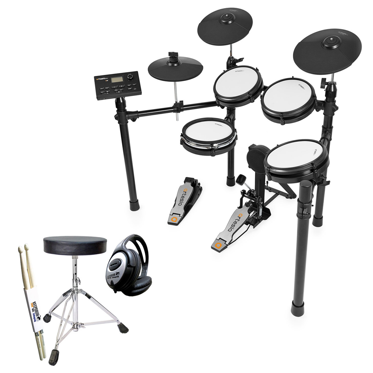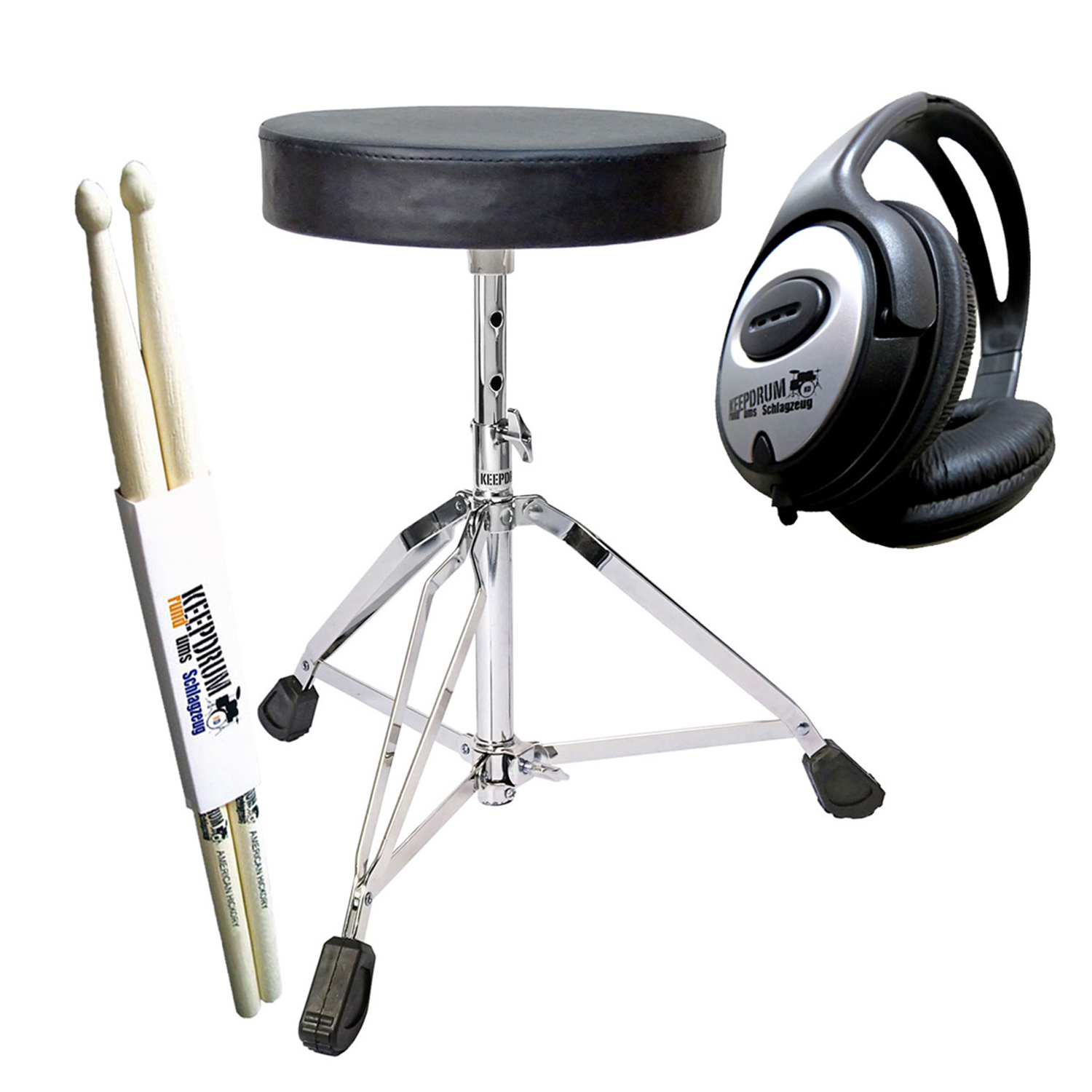 Das Zubehör-Set besteht aus einem vinylbezogenen Drumhocker mit Rundsitz und einer Höhe von 43-54cm, einem Stereo-Kopfhörer zum Anschluss ans Drum-Modul und einem Paar Drumsticks mit Holz-Kopf. Lieferumfang:
