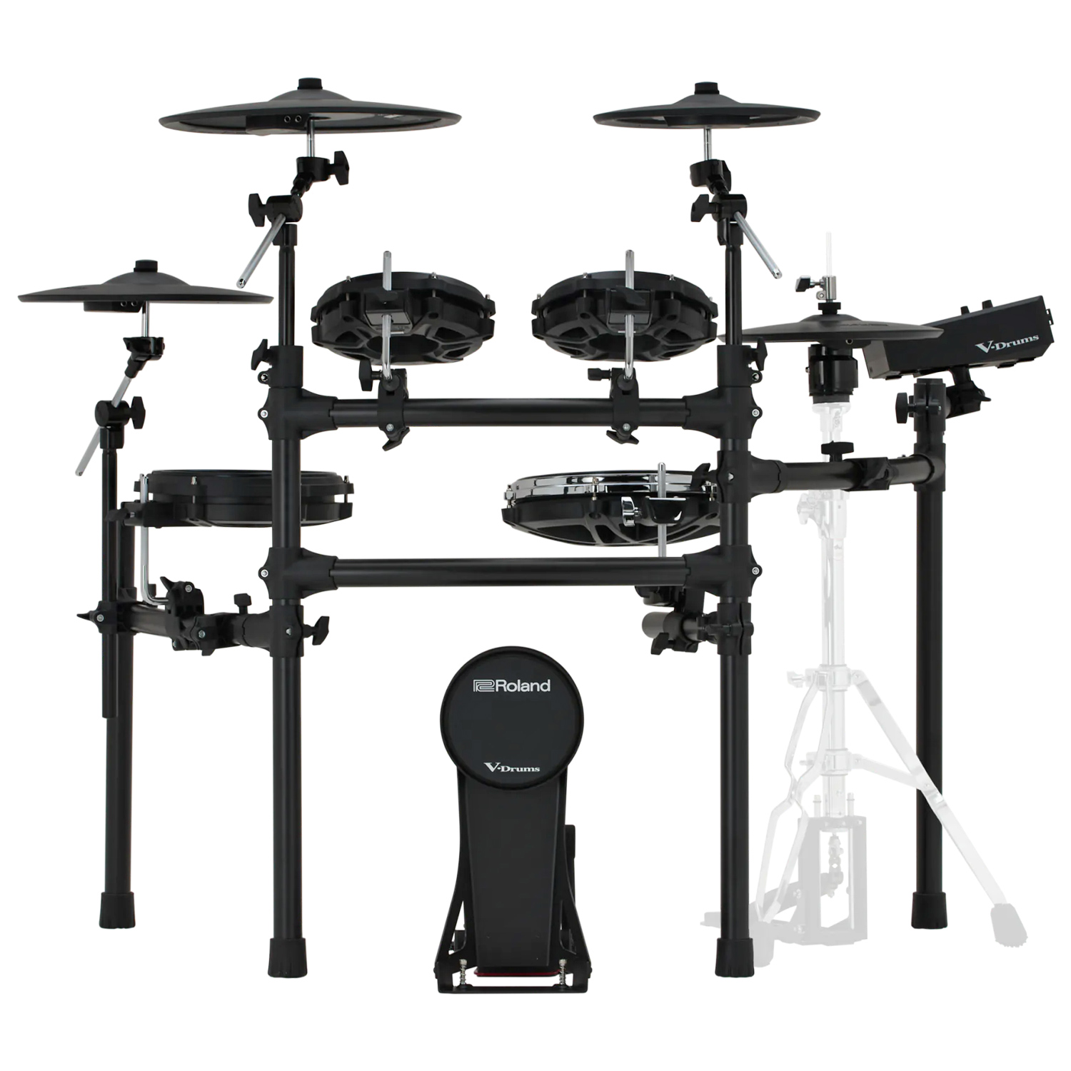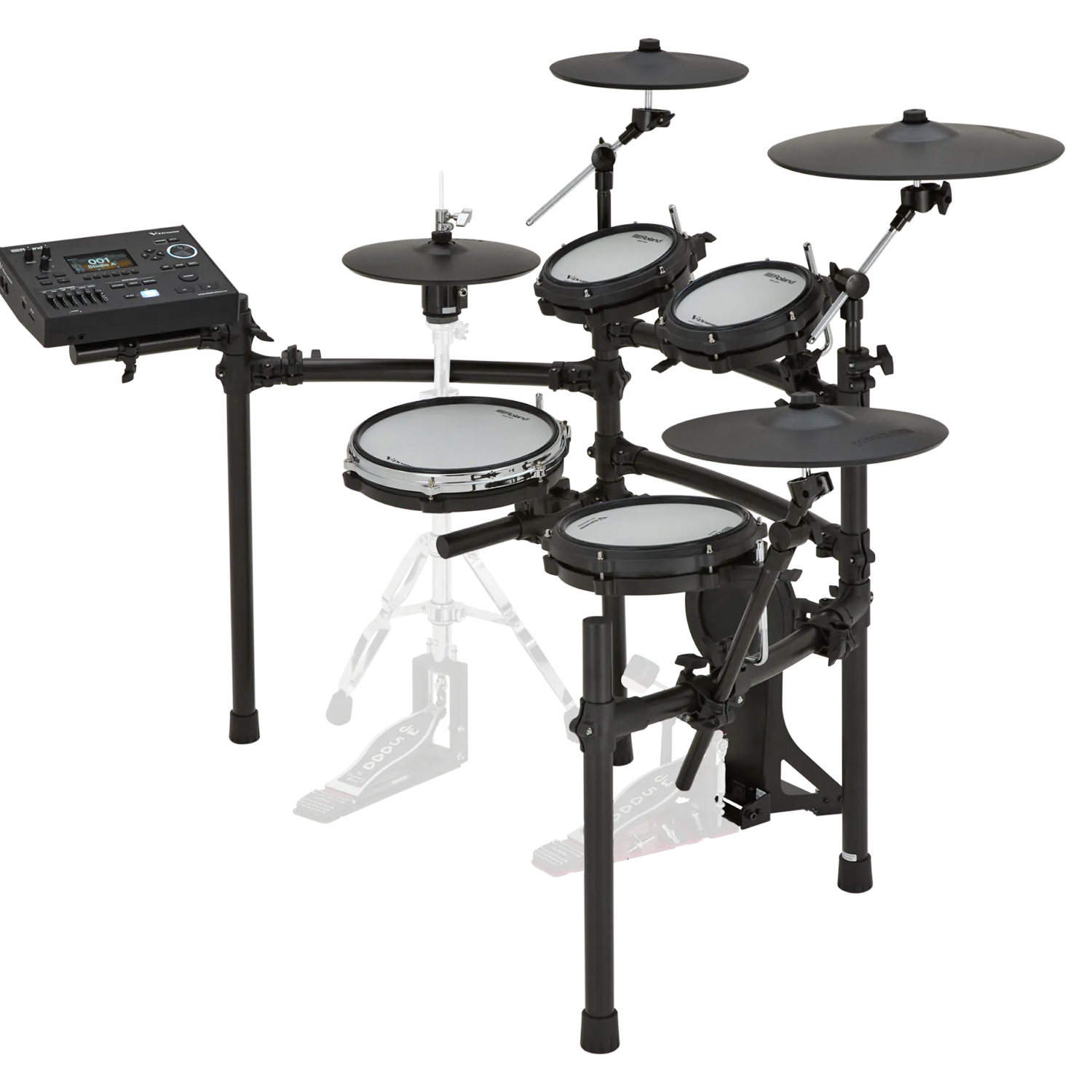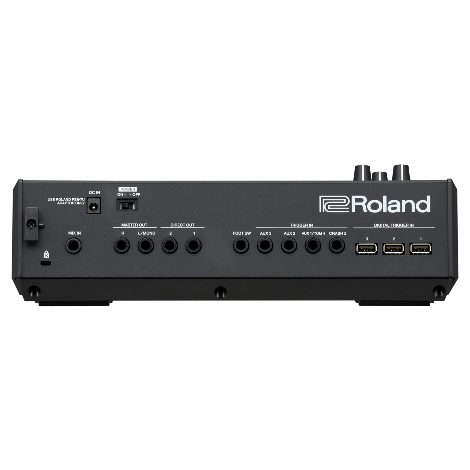 Anschlussseitig bietet das Kit drei digitale Pad-Eingänge, einen Multi-Pin-Trigger-Kabelbaum sowie vier analoge 6,3 mm Triggereingänge. Zudem verfügt es über einen Mono/Stereo-Main-Ausgang, zwei Audio-Direktausgänge und einen analogen Mix-Eingang für ein Wiedergabegerät oder ein Roland Percussion-Pad.