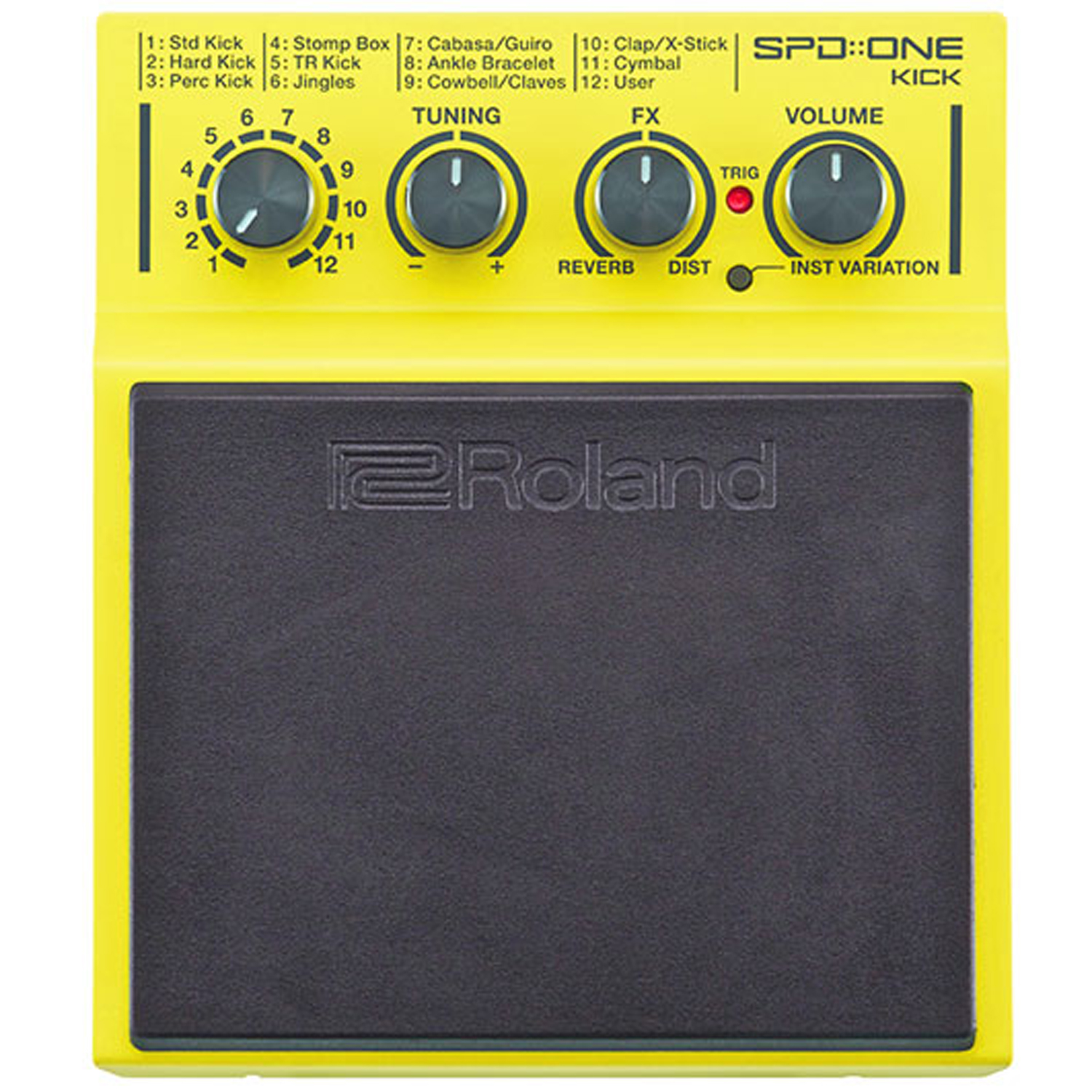 Das Roland SPD::One KICK Pad ist ein digitales Percussion Pad das authentische Kickdrum- und Percussionsounds liefert. Unter den 22 Sounds finden Sich Bassdrums, Stomp-Box-Sounds, Shaker, Cowbell und weitere Percussion Sounds. Hinzukommend ist es möglich ein eigenes Audiosample zu importieren und auf der internen Soundbank zu speichern.Das SPD One Kick lässt sich mit Sticks, Händen oder Füßen spielen, wobei sich der Trigger-Schwellenwert je nach Bedarf anpassen lässt.Die Stromversorgung geschieht über 4 AA Batterien oder ein optional erhältliches Netzteil. Die Bedienung ist denkbar einfach gehalten - über vier Regler wird Sound, Lautstärke, FX (Reverb oder Distortion) und Tuning des Sounds eingestellt.Durch seine kompakte Größe findet sich für das SPD One Kick Pad in jedem Instrumenten Setup genug Platz. Die Montage an Stangen von 8-12,7mm ist möglich.Es eignet sich nicht ausschließlich für Drummer, sondern kann ebenso ideal als Stompbox von Gitarristen genutzt werden. Details: