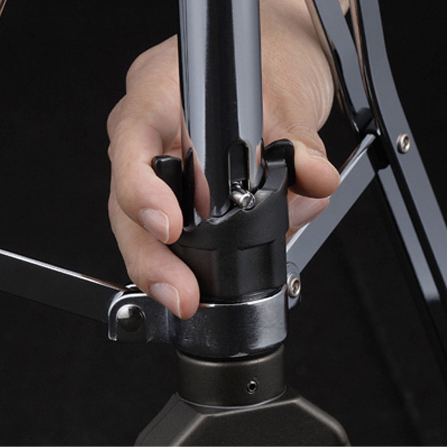 Durch die zweibeinige, drehbare Konstruktion der Hi-Hat-Maschine findet sie auch bei geringem Platzangebot stets genügend Platz. Um ideale Stabilität und Halt zu bieten ist die HHDS1 mit einem kleinen Stabilisator unter dem Footboard ausgestattet. Die Hihat Maschine verfügt dazu über bekannte Features wie die Quick Set Clutch die blitzschnelles montieren und demontieren von Hi-Hat Becken ermöglicht. Die großen Gummifüßchen mit ausfahrbaren Dornen sorgen für die benötigte Rutschfestigkeit.