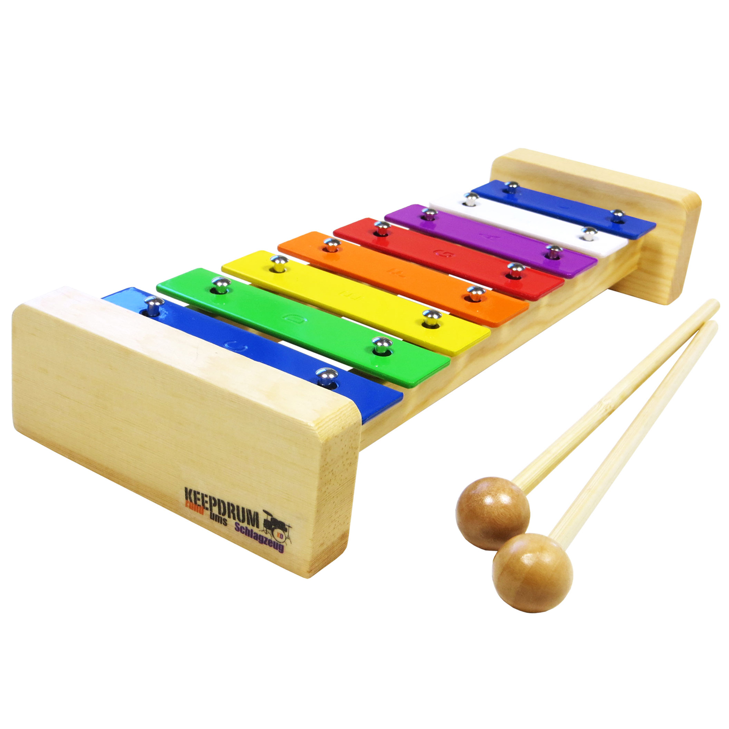 Das keepdrum KGS Pro ist ein Glockenspiel mit bunten Stahl-Klangplatten und Holzrahmen, das sich zur musikalischen Früherziehung und zum Musizieren eignet. Das Spielen auf einem Glockenspiel fördert die Entwicklung der Motorik und der Hand-Augen-Koordination. Die großen, farbigen Klangplatten sind mit Filz unterlegt und liefern einen klaren und angenehmen Ton. Da jeder Ton auf dem Glockenspiel eine eigene Farbe hat, fällt es auch den Jüngsten einfach, Melodien zu erlernen ohne Noten lesen zu können.Das Glockenspiel umfasst einen Tonumfang von einer Oktave von C bis C, wobei jede Klangplatte mit dem entsprechenden Buchstaben für den Ton beschriftet ist. Die Klangplatten sind in Ihrer Tonhöhe sauber aufeinander abgestimmt.Im Lieferumfang enthalten sind zwei Holzschlägel mit einer Länge von je 21cm. Details: