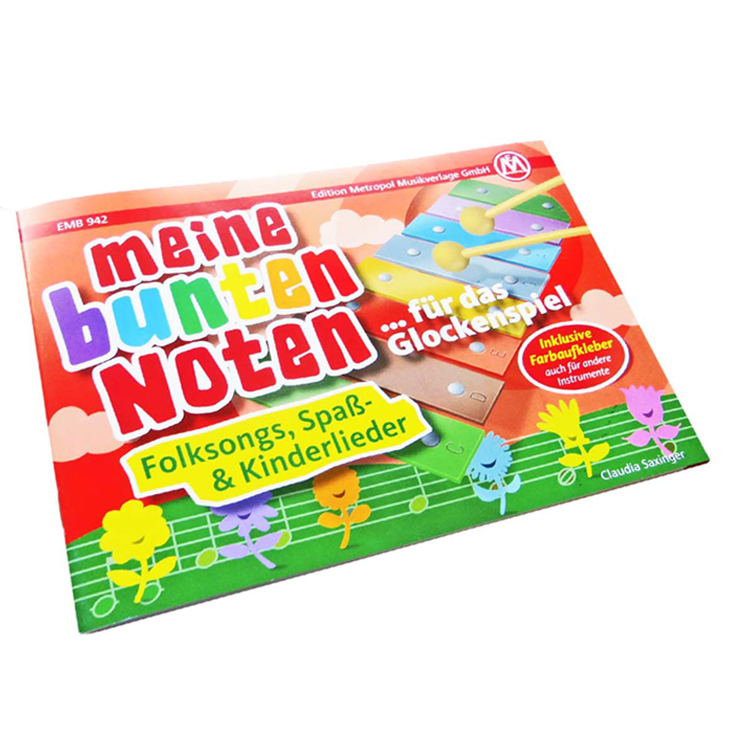 Zusätzlich bietet das Glockenspiel Halterungen für ergänzende Klangplatten (separat erhältlich), sodass der Tonumfang bei Bedarf erweitert werden kann. Für einen leichten Einstieg sind 8 beliebte Kinderlieder mit farbigen Noten enthalten – so macht das Musizieren von Anfang an Spaß!