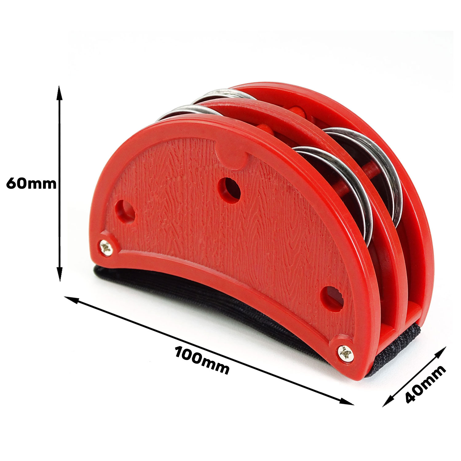 Das robuste Kunststoffgehäuse garantiert Langlebigkeit und eine angenehme Passform am Fuß. Durch die drei Klang-Öffnungen im Gehäuse entsteht ein offener und lebendiger Sound, der sich gut durchsetzt und sich angenehm in das bestehende Klangbild einfügt. Je nach Modell unterscheidet sich der Charakter des Sounds: Das rote Tambourin überzeugt mit einem hellen, weichen und angenehmen Schellenklang, während das schwarze Modell einen tieferen und perkussiven Sound liefert – ideal für prägnante rhythmische Akzente mit klanglichem Kontrast.