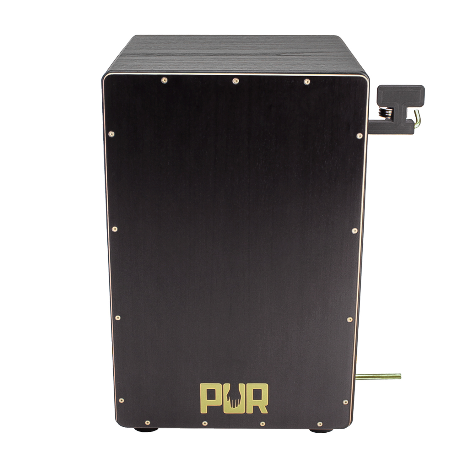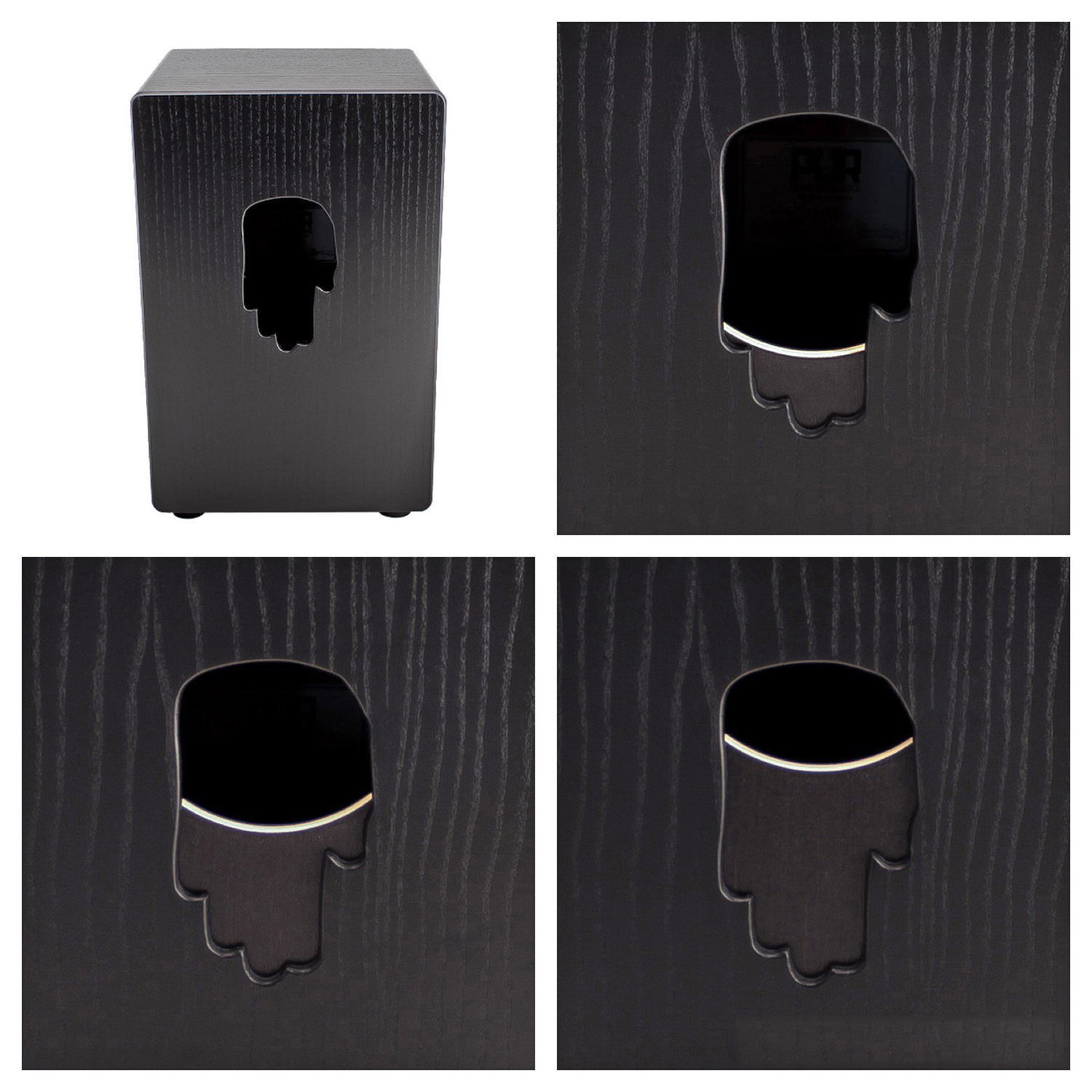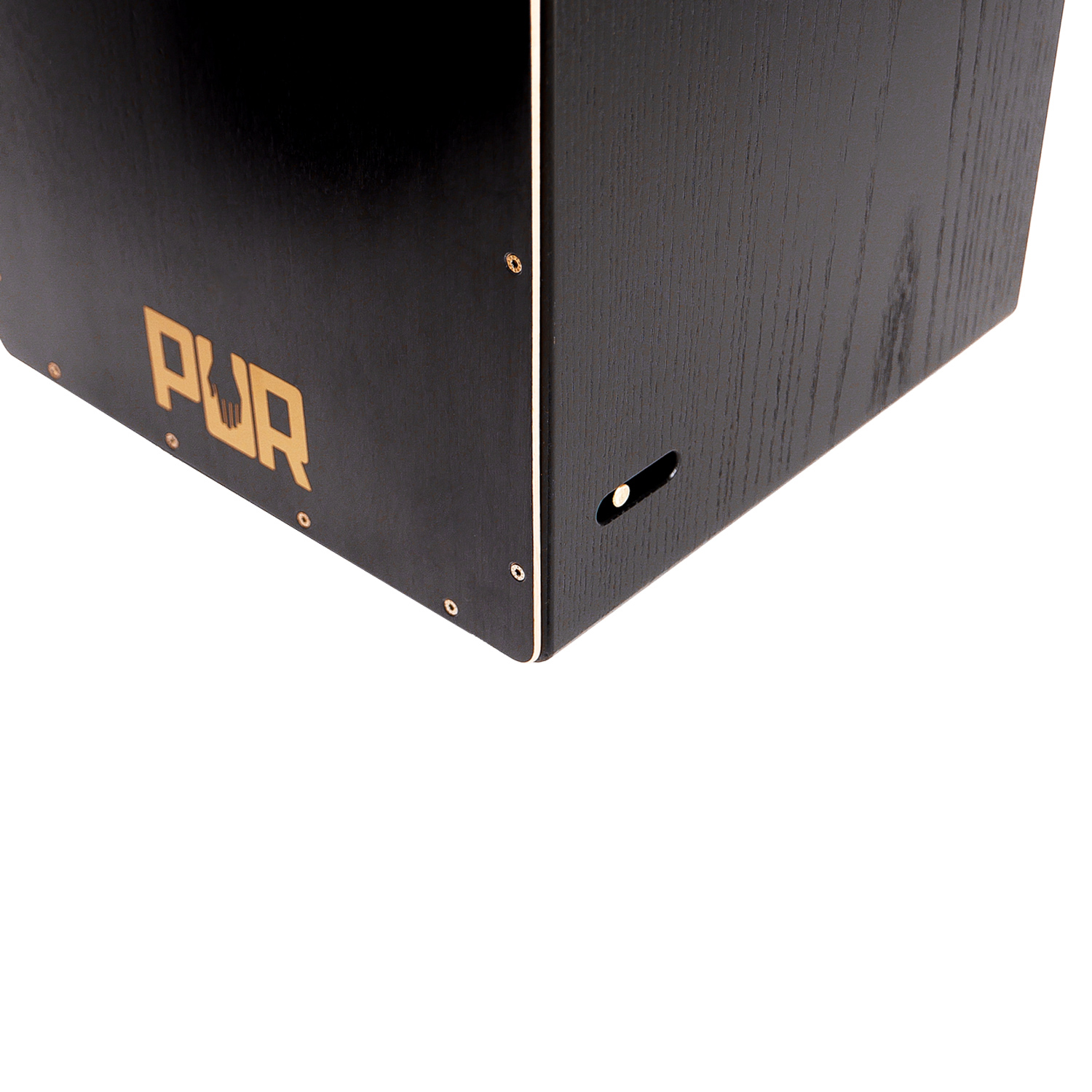 Die Cajon ist handgefertigt in Österreich und besteht aus einem Birkenholz-Korpus mit schwarz gebeiztem Eschefurnier. Die Frontplatte besteht aus einer Sandwich Konstruktion aus Buche und schwarz gebeiztem Aningre Holz.