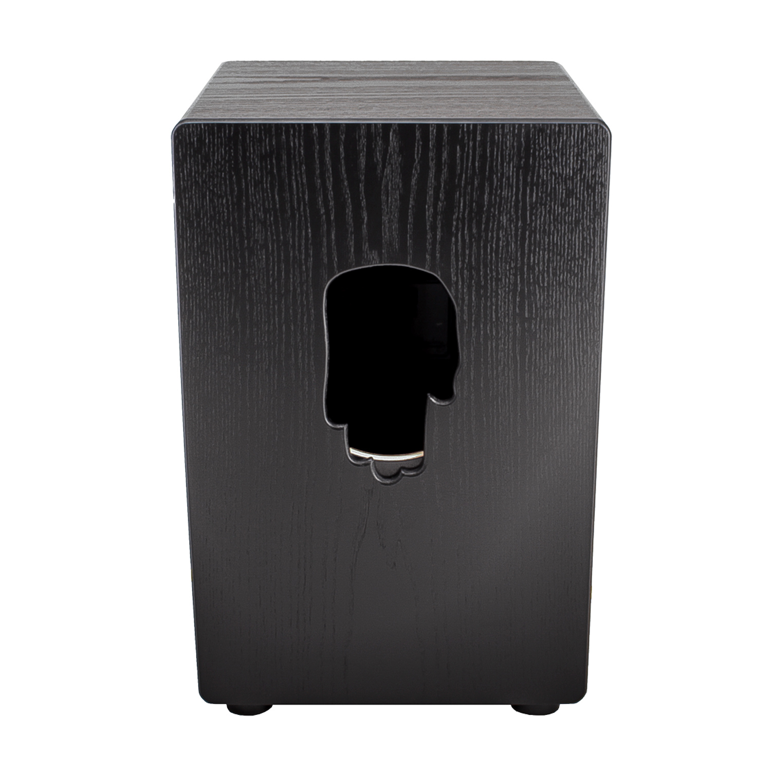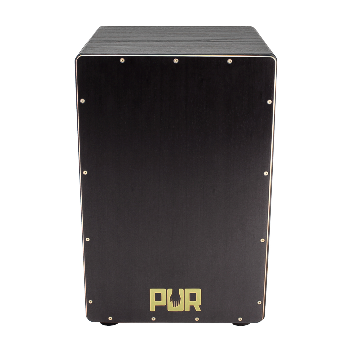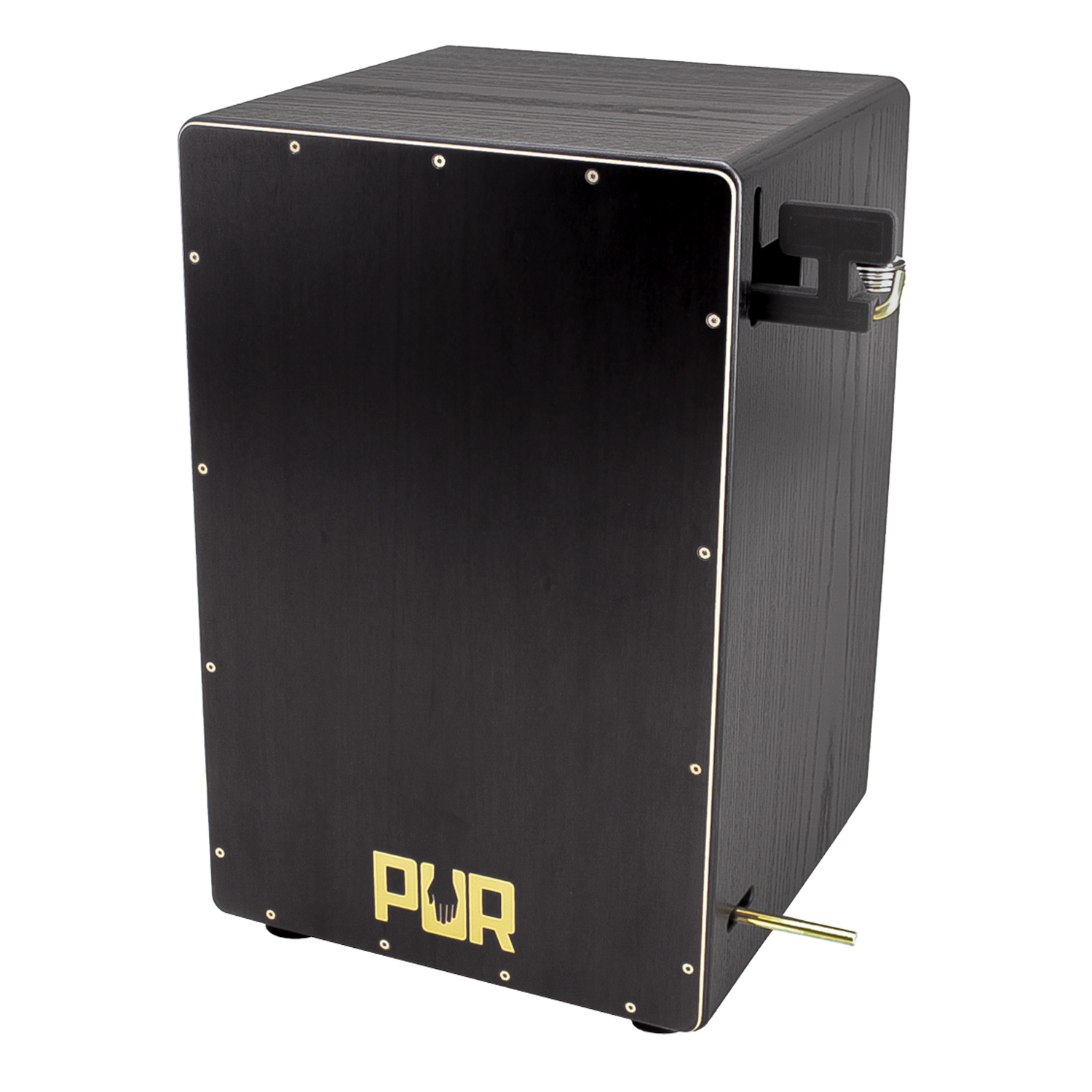 Die Cajon ist handgefertigt in Österreich und besteht aus einem Birkenholz-Korpus mit schwarz gebeiztem Eschefurnier. Die Frontplatte besteht aus einer Sandwich Konstruktion aus Buche und schwarz gebeiztem Aningre Holz.