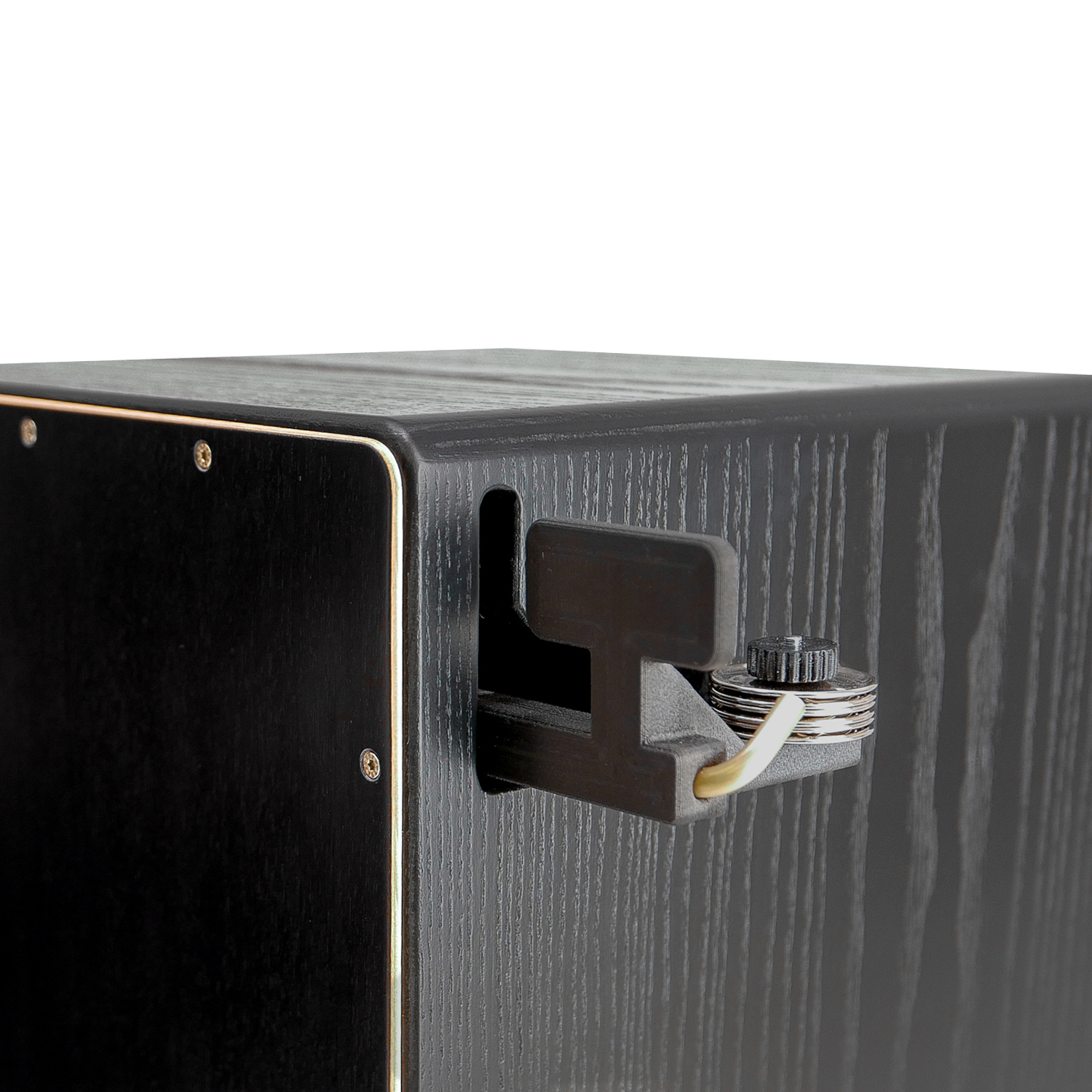 Der Snare Sound kann durch das Heel-Off System unten an der Cajon bequem über einen Hebel mit dem Fuß an- oder abgeschaltet werden. Ebenso kann ohne zusätzliches Werkzeug die Intensität des Snare-Sounds angepasst werden. Die Cajon hat eine klar definierte Snareansprache mit einem durchsetzungsstarken Bass-Sound.