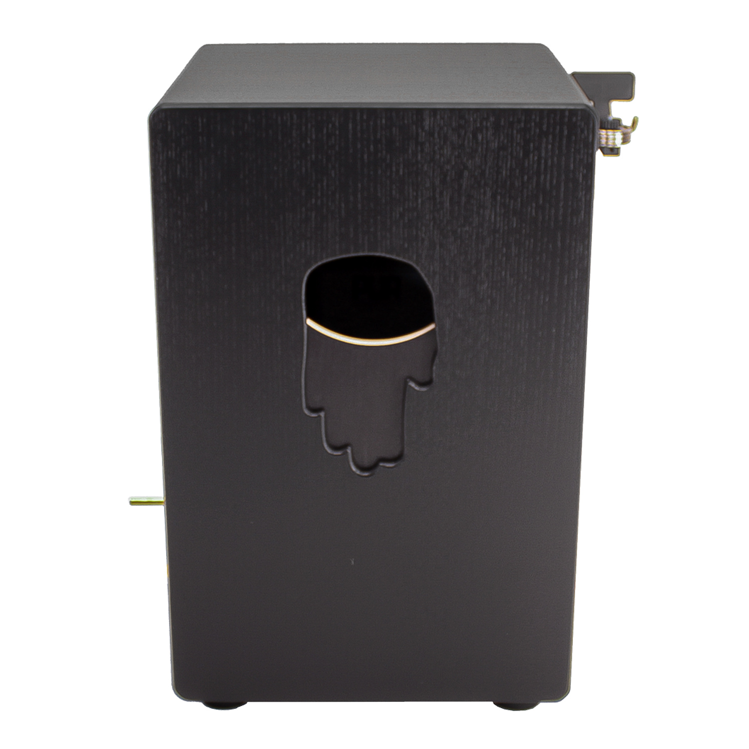Eine weitere Besonderheit ist der integrierte Schallloch-Schieber an der Rückseite der Cajon. Dieser ermöglicht es die Größe des Schallloches zu verändern und somit die Tonhöhe, speziell im Bassbereich, zu beeinflussen.