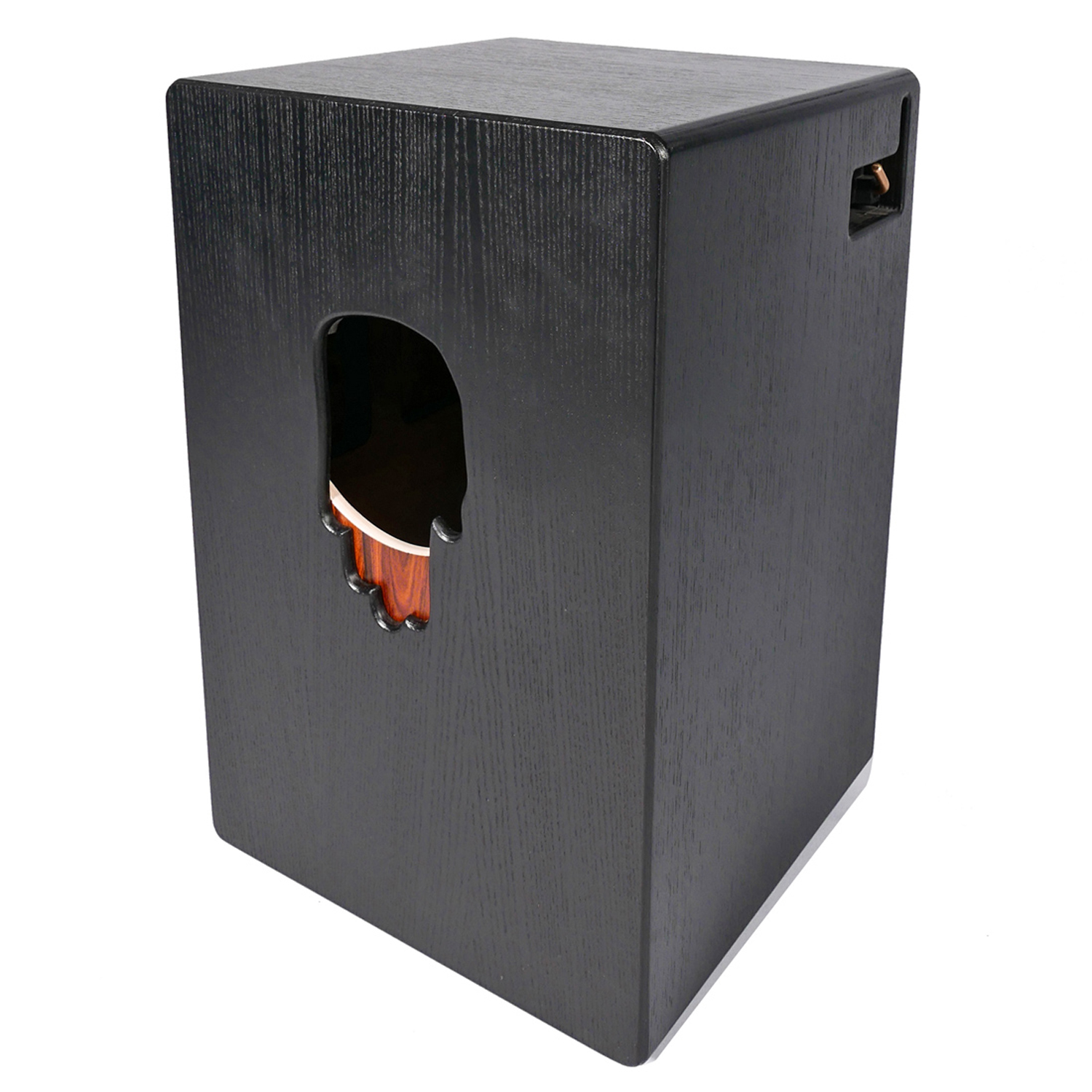 Die Cajon ist handgefertigt in Ösrerreich und besteht aus einem Birkenholz-Korpus mit schwarz gebeiztem Eschefurnier. Die Frontplatte ist aus zertifiziertem Santos Palisander Holz gefertigt.