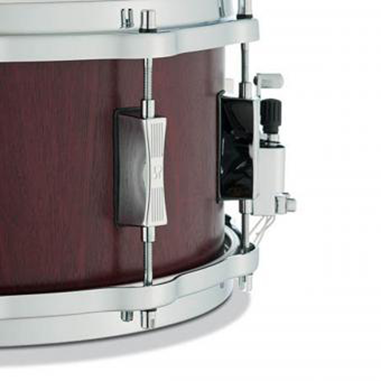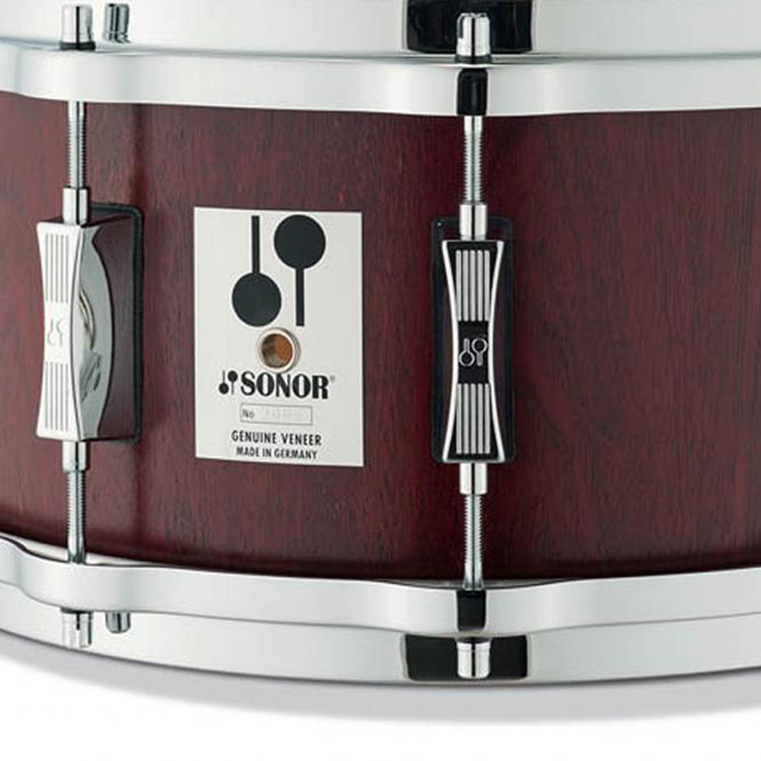 Der Kessel besteht aus 9 Schichten und einer Oberfläche die mit einem MahagonyFinish überzogen ist. Auch die Innenseite des Kessels ist furniertund aus Buchenholz gefertigt. Die Gussspannreifen runden die edleOptik der Snaredrum ab und sorgen für ein stabiles Tuning. AlsSnareabhebung ist eine Sonor Throw-Off Abhebung verbaut.