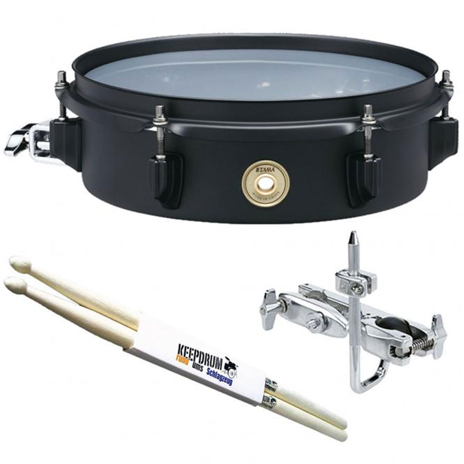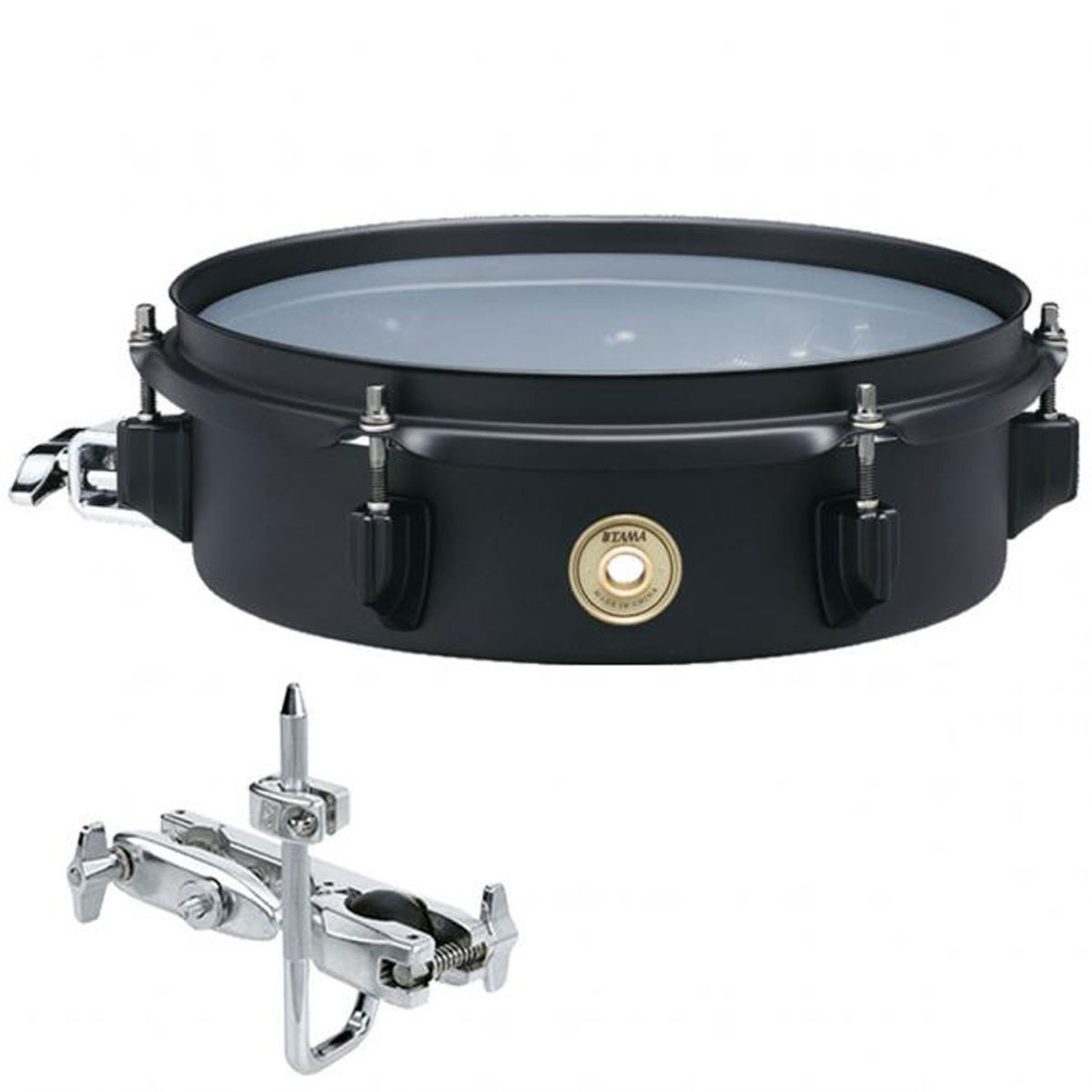 Die Tama BST103MBK Metalworks Tymp Snaredrum ist eine 10x3 Zoll große Effekt-Snare die einen knackigen, definierten Sound mit kurzem Sustain liefert. Der Kessel ist aus 1mm starkem Stahl gefertigt mit schwarzem Finish und Triple Flanged Hoop Spannreifen.