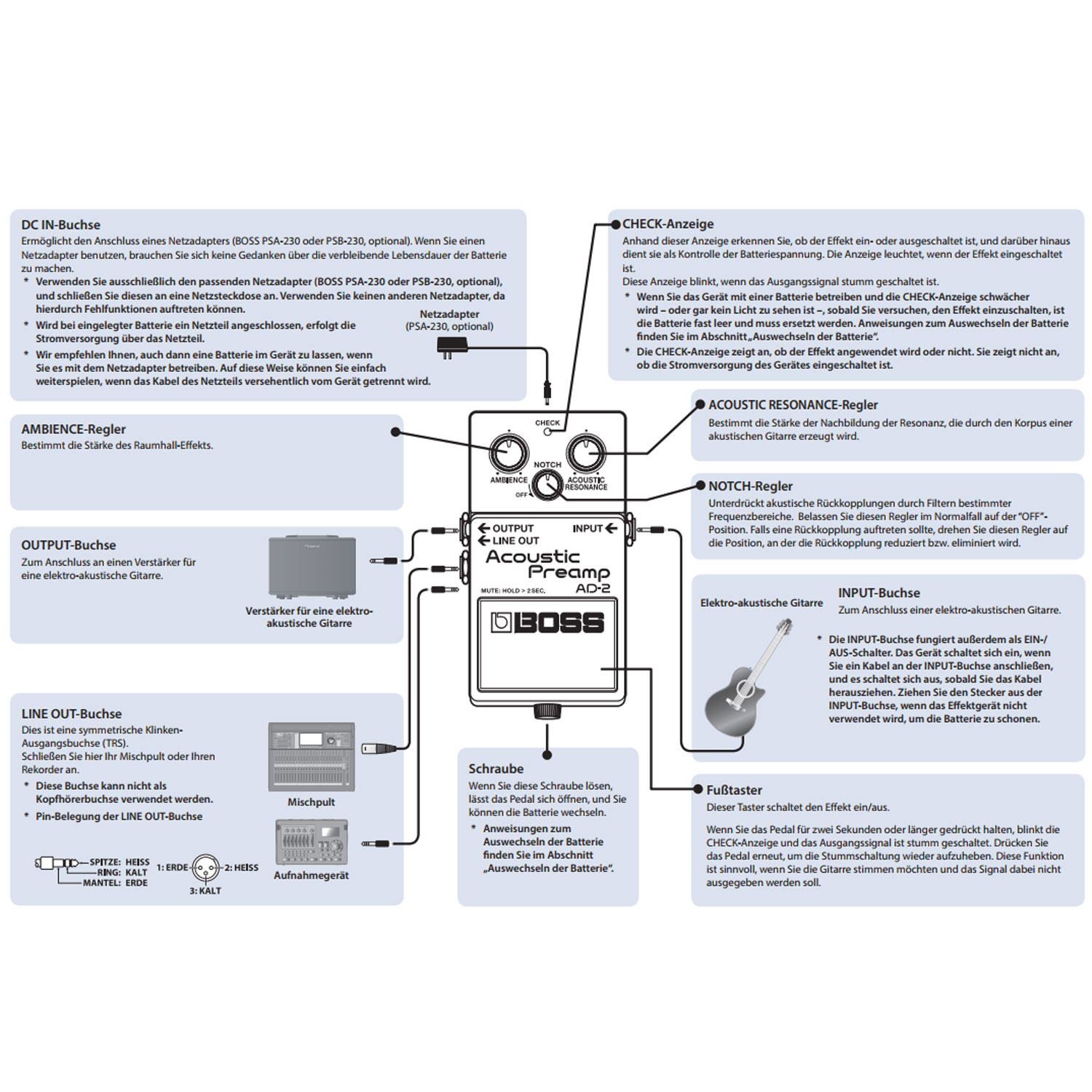 Der AD-2 bietet 2 Ausgänge - über die OUTPUT Buchse kann ein Verstärker für Akustik-Gitarren angeschlossen werden, über den LINE OUT (TRS) kann ein Mischpult oder Aufnahmegerät angeschlossen werden. Das Raumhall-Signal kann wahlweise nur über die OUTPUT Buchse ausgegeben werden oder über beide Ausgänge OUTPUT und LINE OUT.