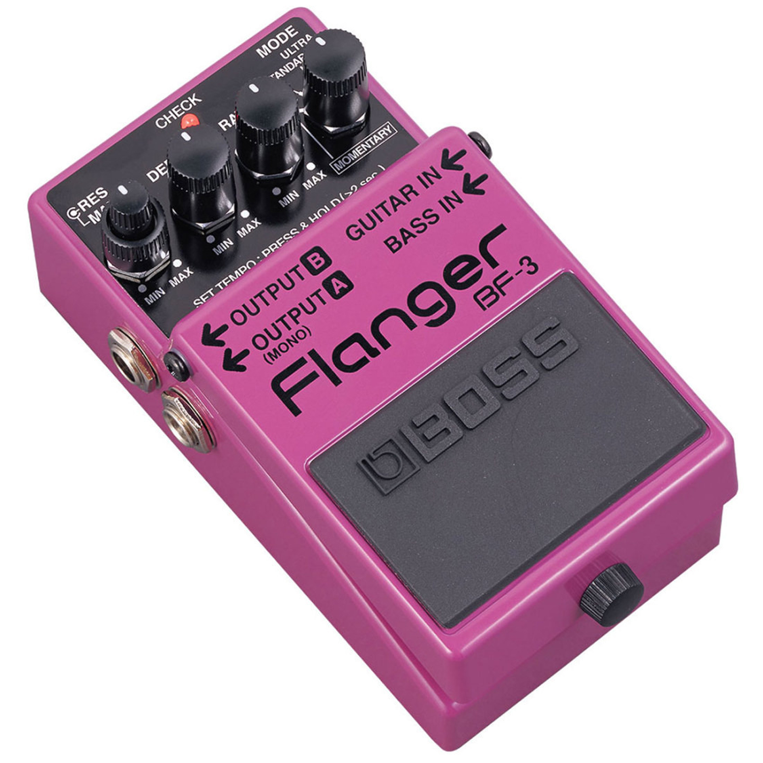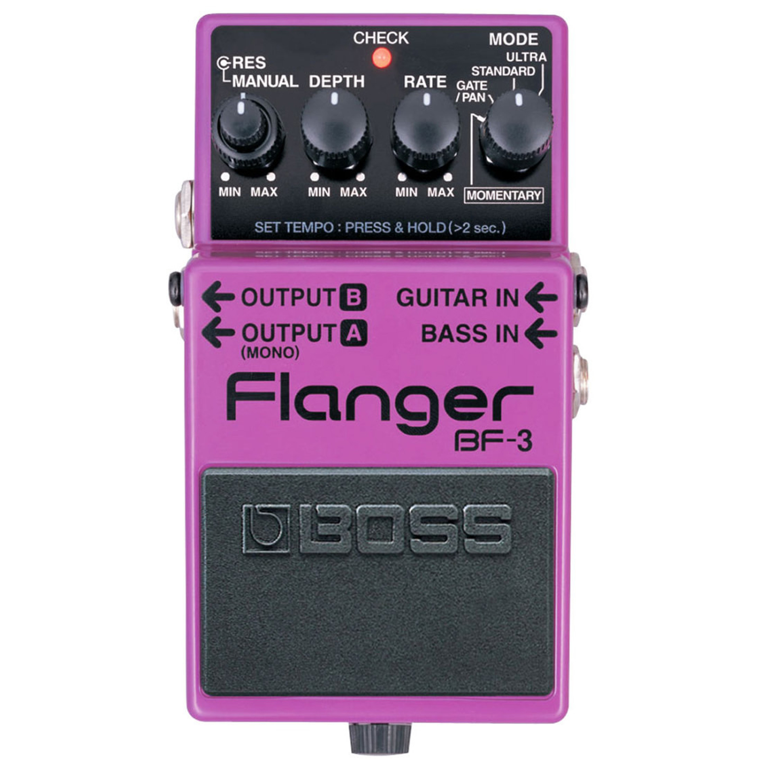 Der Boss Flanger BF-3 gehört zu den klassikern von Boss und liefert fette Flanger-Sounds mit viel Tiefe. Das Pedal eignet sich für Gitarre und Bass ebenso wie für z.B. E-Piano/Keyboards. Es stehen für Gitarre und Bass je ein, auf das Instrument optimierter, Eingang zur Verfügung.Der BF-3 überzeugt durch seine Soundqualität, die Soundtiefe und Räumlichkeit,sowie die große Klangvielfalt bei extrem geringem Rauschen - verstaut im robusten Metall-Gehäuse.Der Sound wird über die Regler Depth, Width, Resonance (fungiert ähnlich einem Feedbackregler) und Manual verändert. Die Soundmöglichkeiten reiche hierbei vom dezenten Chorus-Sound bis zum schneidenden Düsenjet Sound. Der BF-3 verfügt über neue Modi gegenüber seinem Vorgänger und produziert Stereosounds mit hervorragender Räumlichkeit. Über den Gate/Pan Regler können sogar SLicer-artige Effekte erzielt werden.Die Stromversorgung geschieht über eine 9V Batterie oder ein optionales Netzteil (nicht im Lieferumfang enthalten). Details: