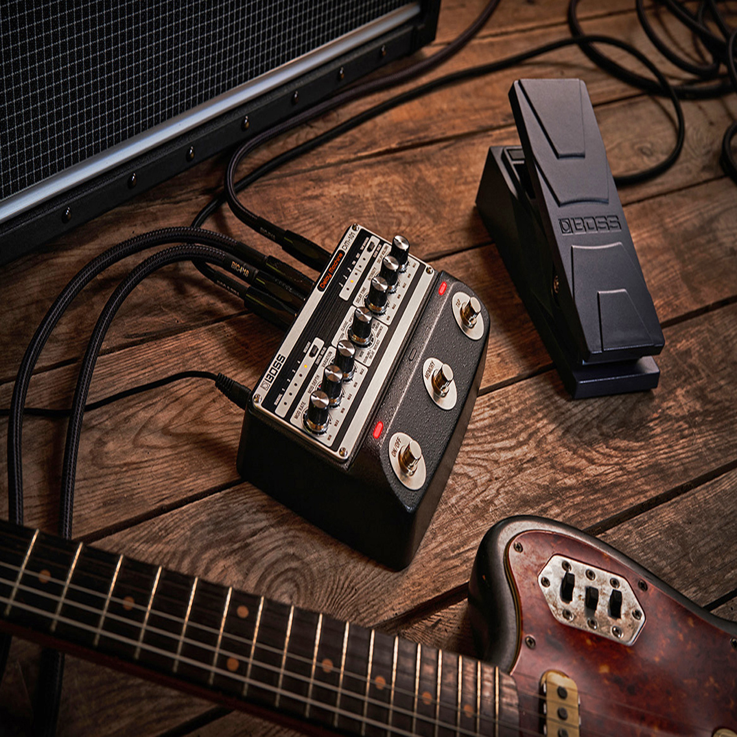 Es stehen vier integrierte Speicherplätze zur Verfügung auf denen Presets abgespeichert und schnell wieder aufgerufen werden können. Zudem können bis zu zwei Fußtaster oder Expression-Pedale für eine erweiterbare Steuerung angeschlossen werden.