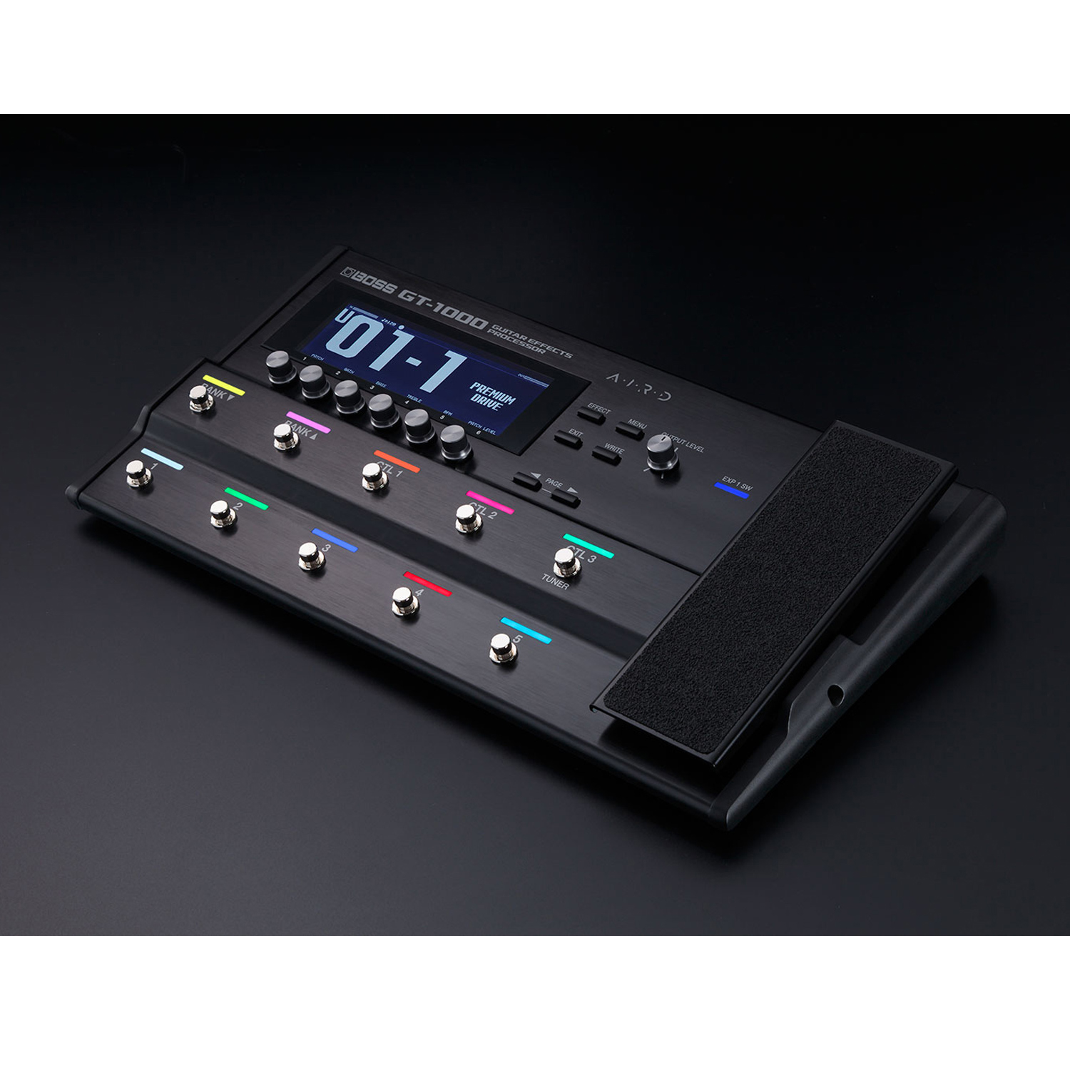 Der Boss GT-1000 ist ein Modeling-Effektgerät, für Gitarren und Bässe, mit der neuen AIRD (Augmented Impulse Response Dynamics) Technologie. Diese innovative Entwicklung liefert authentische Röhrenamp-Sounds in einem digitalen Format und setzt damit neue Maßstäbe in der Klangqualität digitaler Effektgeräte. Eines der Merkmale ist die hochwertige Signalverarbeitung, die dank der 32-Bit AD/DA-Wandlung und einer Samplingrate von 96 kHz eine besonders detaillierte und klare Klangwiedergabe ermöglicht.