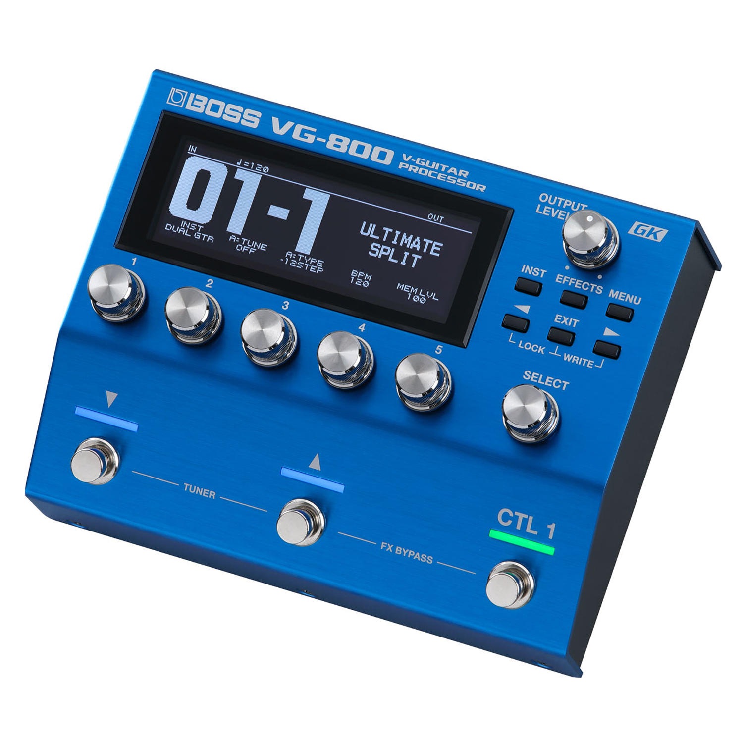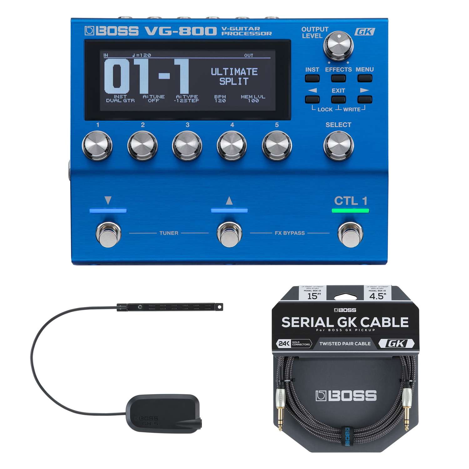 GK-Tonabnehmer erforderlich ist - der GK-5 für Gitarren oder der GK-5B für Bässe. Des Weiteren bietet das Gerät einen Gitarreneingang für den Einsatz herkömmlicher Gitarren und Bässe. Instrumenten-Modelling-Funktionen stehen an diesem Eingang nicht zur Verfügung, so stehen in dem VG-800 nur Verstärker und Effekte zur Verfügung.