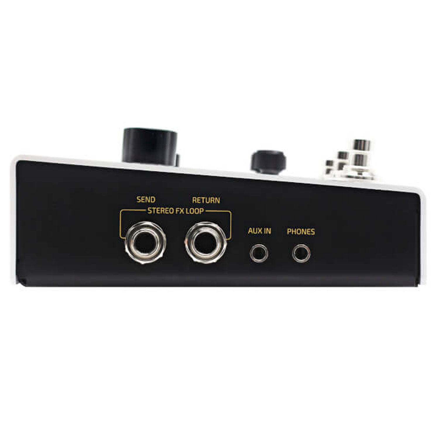 Die Bedienung erfolgt intuitiv über einen hochwertigen 4-Zoll-Touchscreen mit 800 x 480 Pixeln Auflösung, der auch komplexe Einstellungen mühelos ermöglicht. Die umfassende Konnektivität inklusive Stereo FX Loop, MIDI I/O und USB-C Audio-Interface mit 8 Eingängen und 8 Ausgängen macht das Gerät zur komplett ausgestatteten Produktionszentrale. Neben den Main Outs zum Anschluss an eine PA-Anlage steht ein Kopfhöreranschluss sowie ein Aux In Anschluss zur Verfügung. Drei frei zuweisbare Fußtaster mit Halo-LEDs, ein integrierter Stereo-Looper mit 60 Sekunden Aufnahmezeit und 300 speicherbare Patches bieten maximale Flexibilität im Live-Einsatz.