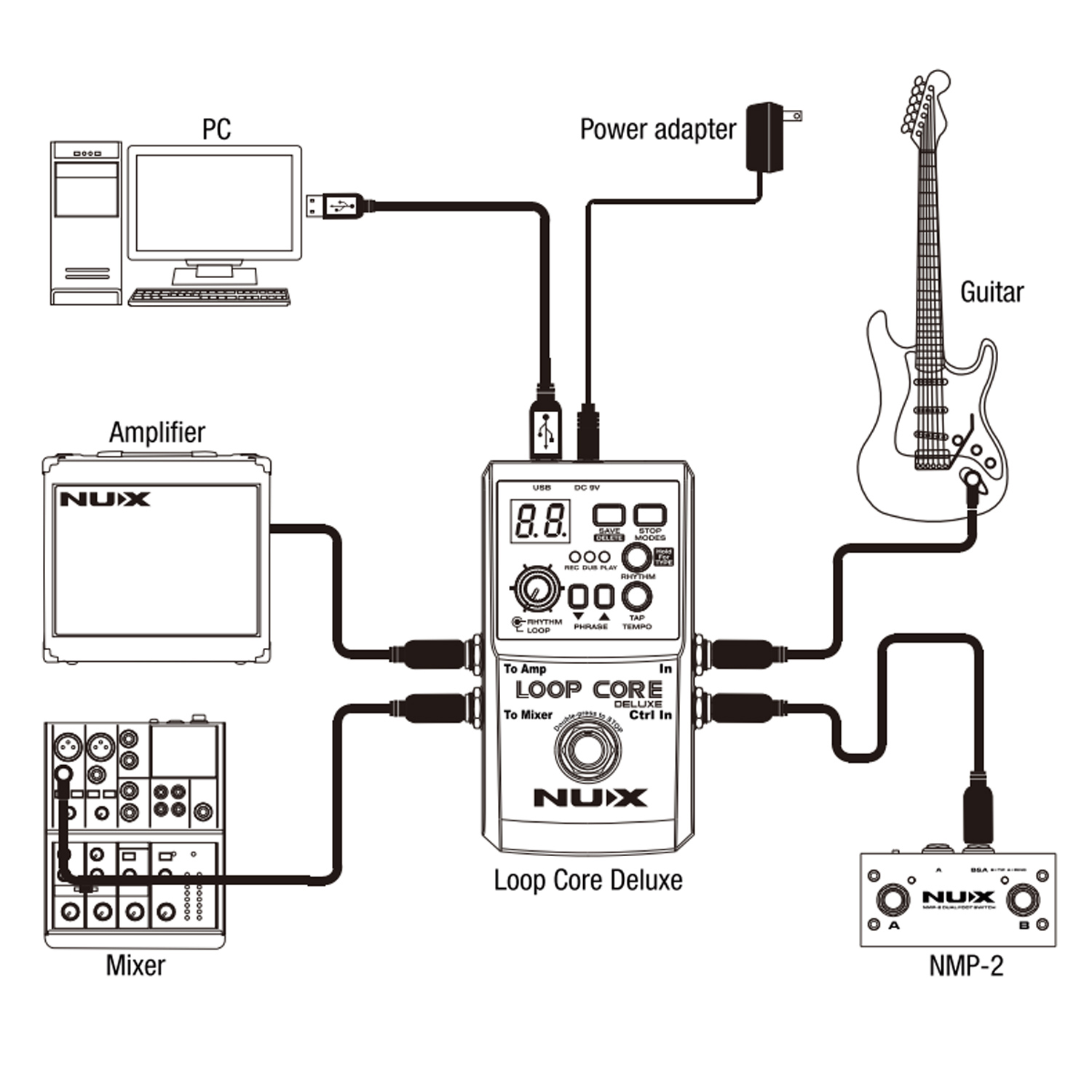 Über den Mini-B USB-Anschlss kann der Loop Core Deluxe an einen Computer angeschlossen werden, um Loop-Phrasen zum importieren oder abzuspeichern. Hier ist zu beachten dass der Loop Core Deluxe nur mit 24-Bit/44,1 kHz WAV-Dateien kompatibel ist. Mit der kostenlosen Nux Audio Converter-Software kann jede Audiodatei konvertiert werden um sie kompatibel zu machen.