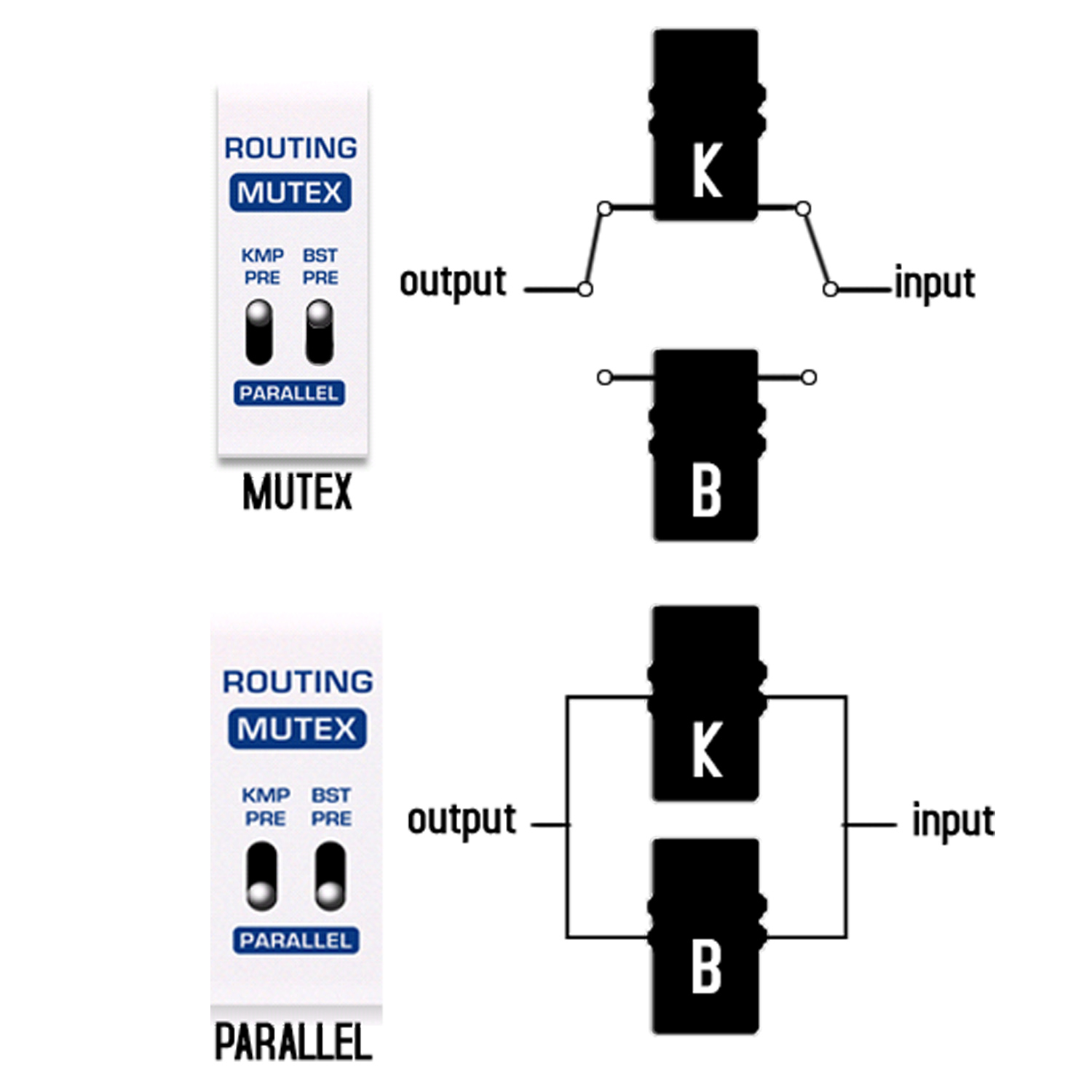 Das Nux Masamune verfügt über ein Innenrouting mit 3 Funktionen. Es können beide Effekte in Parallelschaltung gewählt werden. Es kann MUTEX eingeschaltet werden um jeweils nur einen Effekt zu aktivieren. Es kann auch gewählt werden welcher Effekt in der Signalkette an erster Stelle stehen soll.