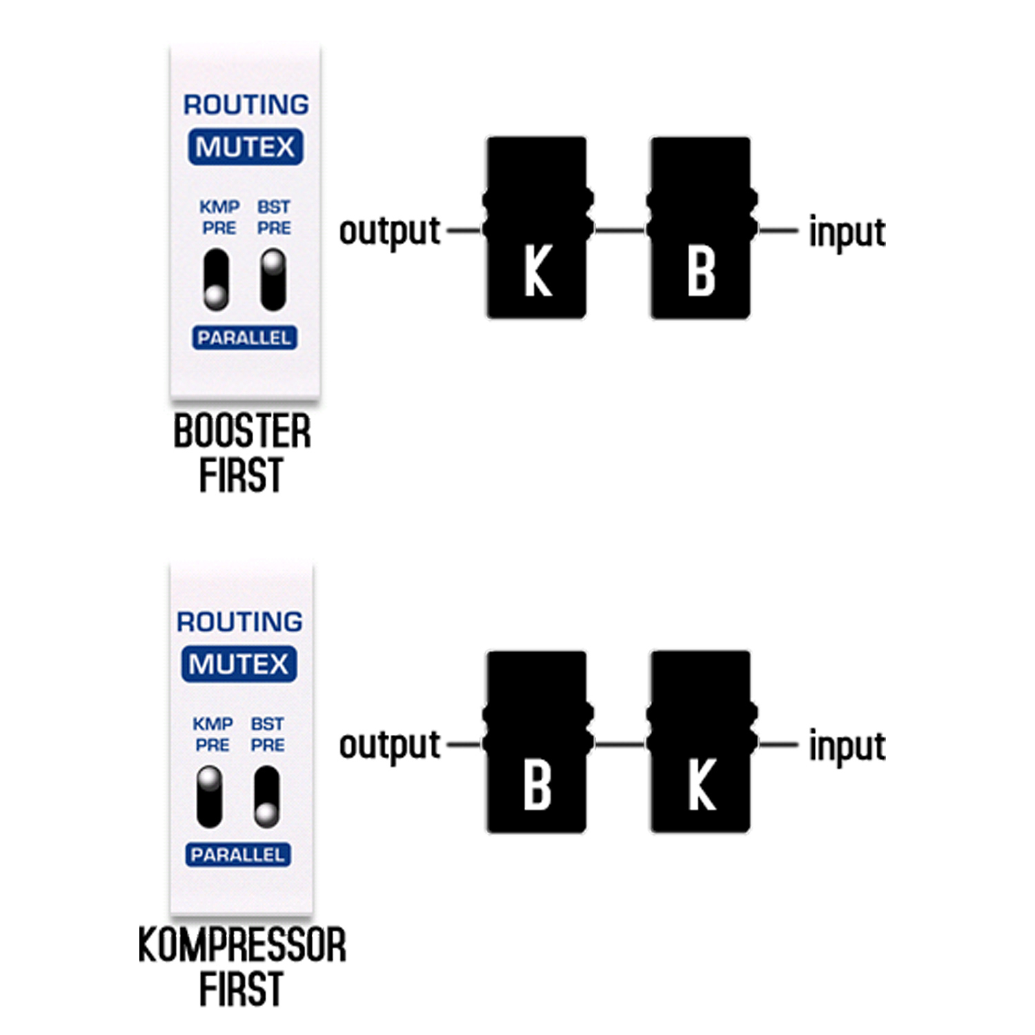 Das Nux Masamune verfügt über ein Innenrouting mit 3 Funktionen. Es können beide Effekte in Parallelschaltung gewählt werden. Es kann MUTEX eingeschaltet werden um jeweils nur einen Effekt zu aktivieren. Es kann auch gewählt werden welcher Effekt in der Signalkette an erster Stelle stehen soll.
