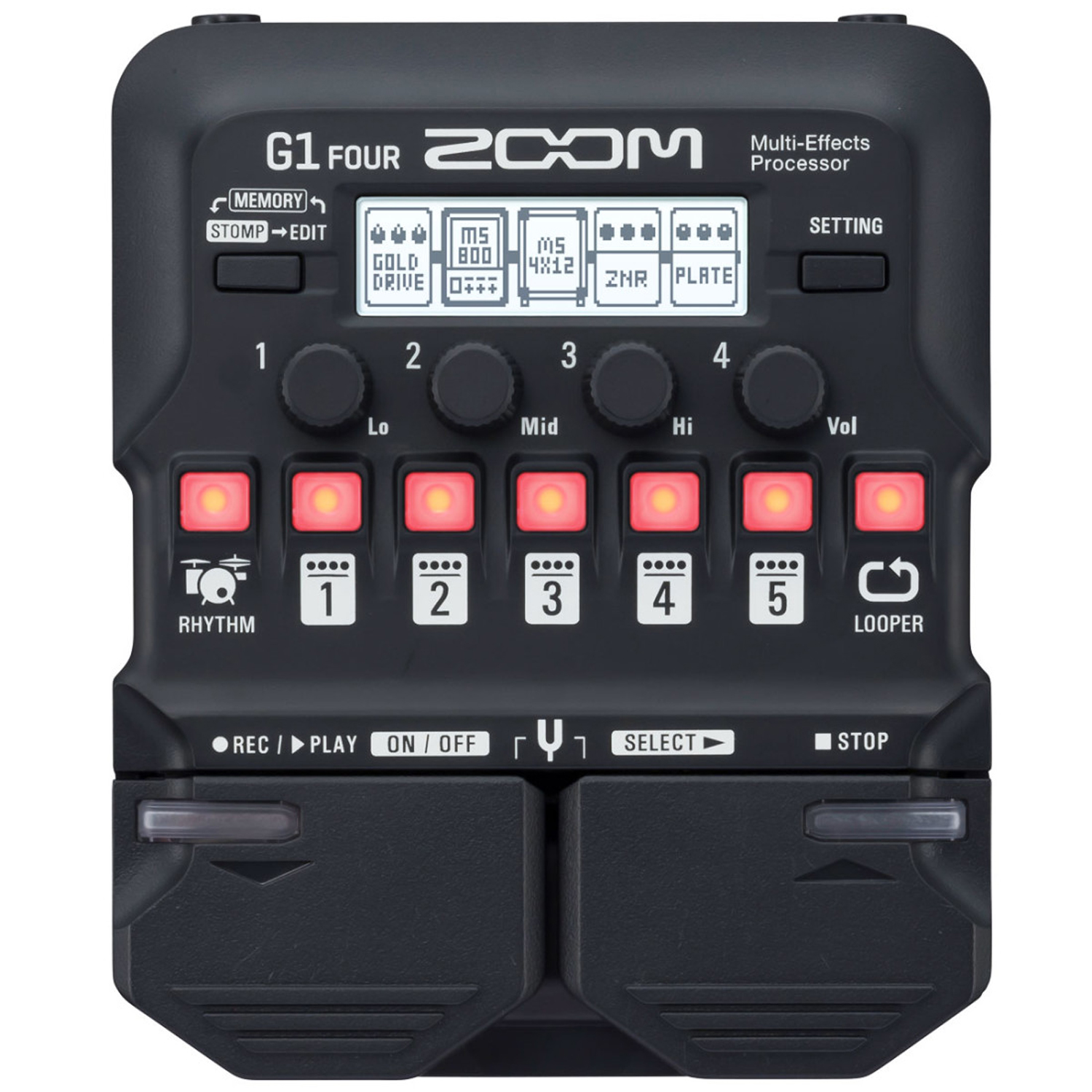 Von den 60 Effekten können bis zu 5 Effekte gleichzeitig genutzt werden. Die Bedienoberfläche wurde beim G1 Four sinnvoll überarbeitet und bietet nun sofortzugriff auf den Looper und die Rhythmus-Sektion. Über das Display wird die Signalkette angezeigt und sämtliche Parameter können schnell und übersichtlich nach Wunsch angepasst werden.
