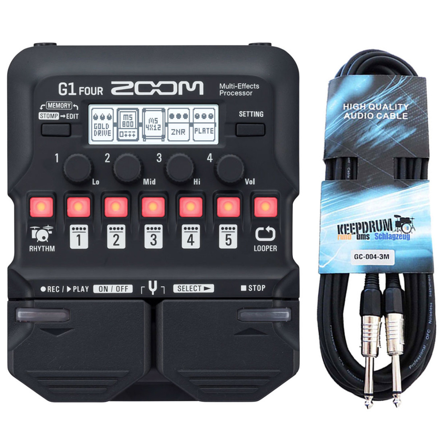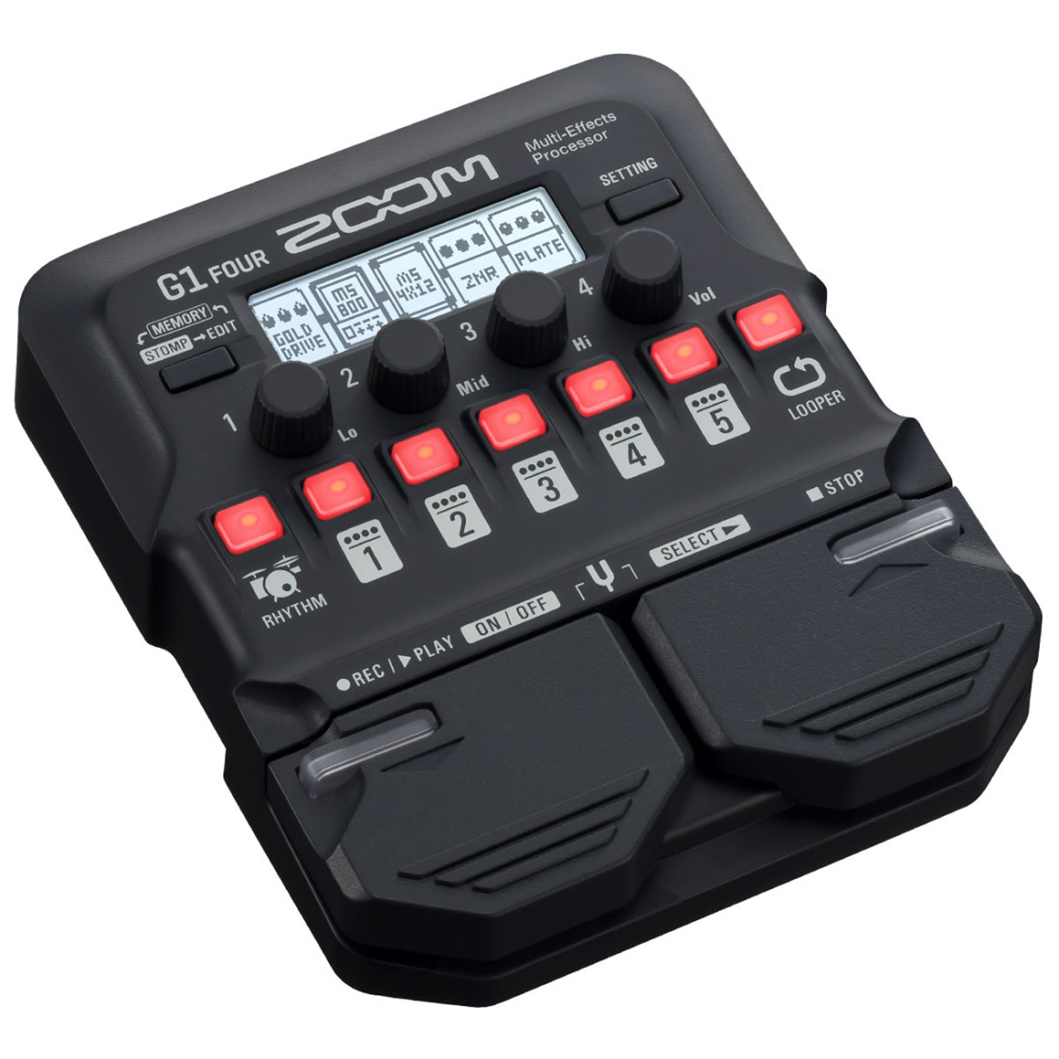 Von den 60 Effekten können bis zu 5 Effekte gleichzeitig genutzt werden. Die Bedienoberfläche wurde beim G1 Four sinnvoll überarbeitet und bietet nun sofortzugriff auf den Looper und die Rhythmus-Sektion. Über das Display wird die Signalkette angezeigt und sämtliche Parameter können schnell und übersichtlich nach Wunsch angepasst werden.