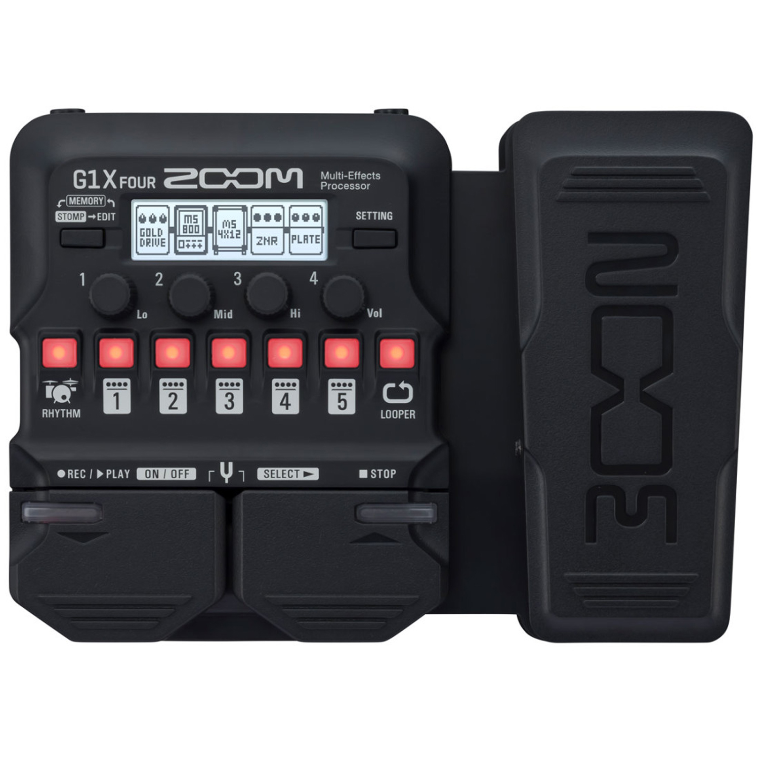 Von den 60 Effekten können bis zu 5 Effekte gleichzeitig genutzt werden. Die Bedienoberfläche wurde beim G1 Four sinnvoll überarbeitet und bietet nun direkten Zugriff auf den Looper und die Rhythmus-Sektion. Über das Display wird die Signalkette angezeigt und sämtliche Parameter können schnell und übersichtlich nach Wunsch angepasst werden.
