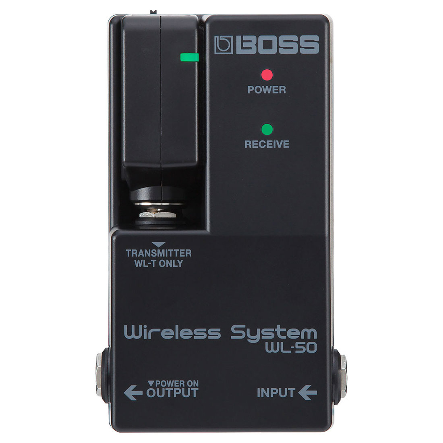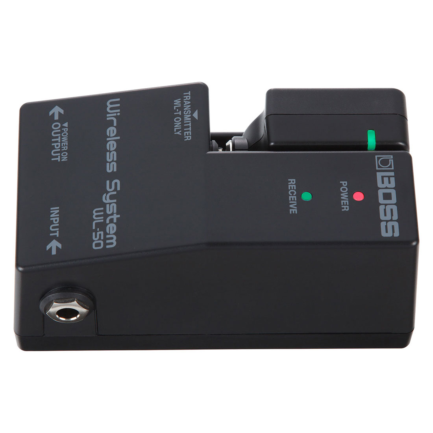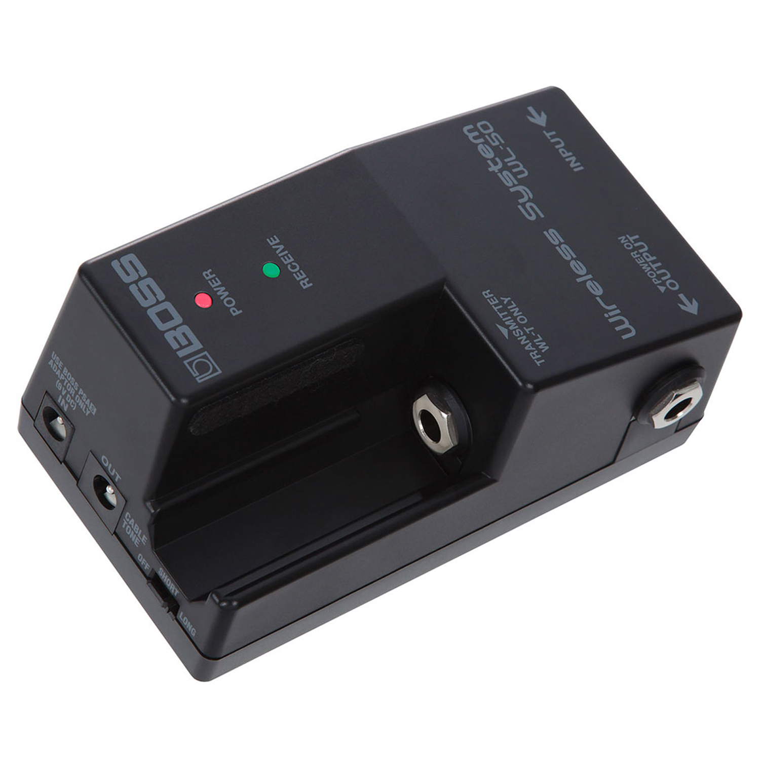 Der integrierte aufladbare Akku des Senders liefert bis zu 12 Stunden Betriebszeit mit einer Ladung. Der Empfänger benötigt ein Netzteil (nicht im Lieferumfang) wie alle gängigen Boss-Effektpedale oder 2 AA Batterien.
