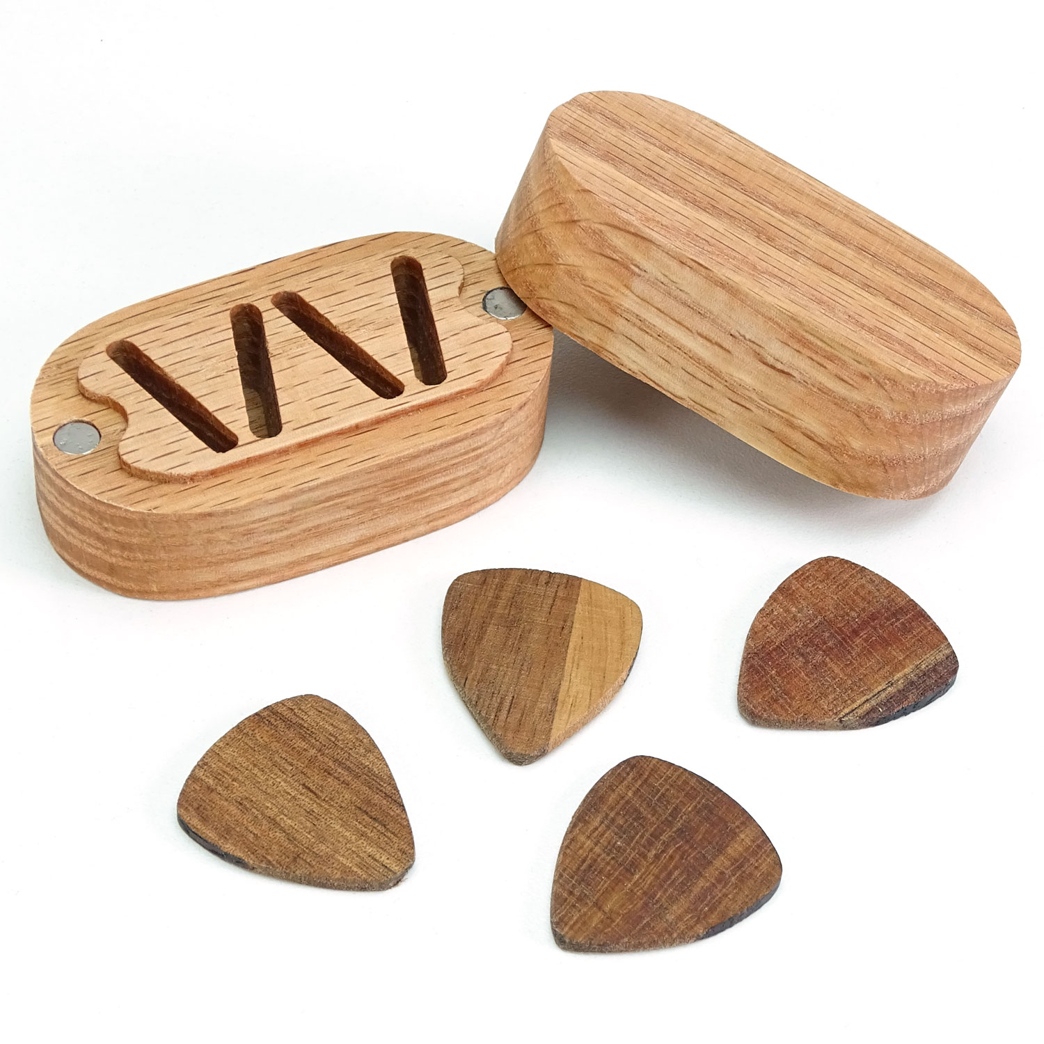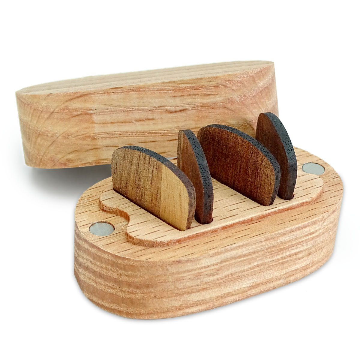 Diese stilvolle Aufbewahrungs-Box aus Eichenholz wird zusammen mit vier Holz-Plektren geliefert und eignet sich ideal zur Aufbewahrung und zum Transport deiner Gitarren-Picks oder als originelles Geschenk für Musiker.
