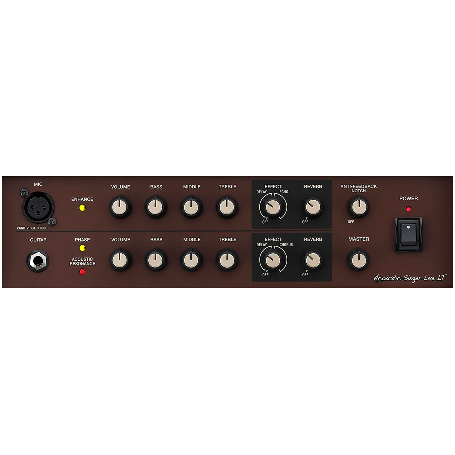 Der Gitarrenkanal arbeitet mit dem Acoustic Resonance Processing von Boss und macht aus dem harten sterilen Piezo-Tonabnehmer-Bühnensound einen angenehmen und natürlichen Klang. Der Acoustic Singer Live LT bietet ebenso Delay, Reverb und Chorus Effekt, die separat für jeden Kanal eingestellt werden können. Dazu kommt der Enhance-Effekt für den Mikrofonkanal der für eine automatische Klangoptimierung des Mikrofonkanals sorgt um den Gesang klanglich aufzuwerten.