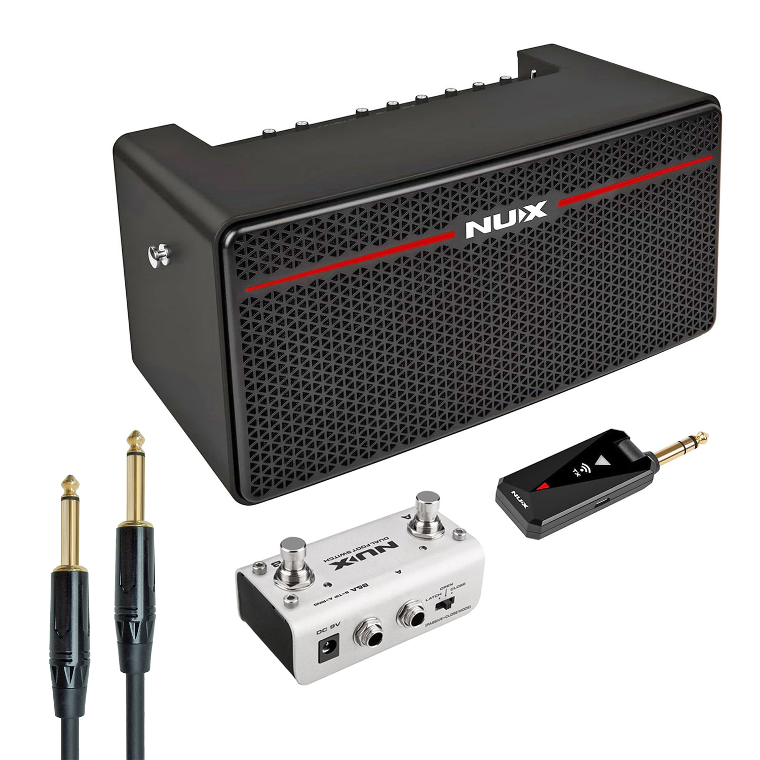 Da der Verstärker mit dem Nux-Funksender B5-RC ausgestattet ist kann er komplett kabellos genutzt werden und ist mit Gitarre, Bass sowie aktiven und passiven Tonabnehmern kompatibel.
