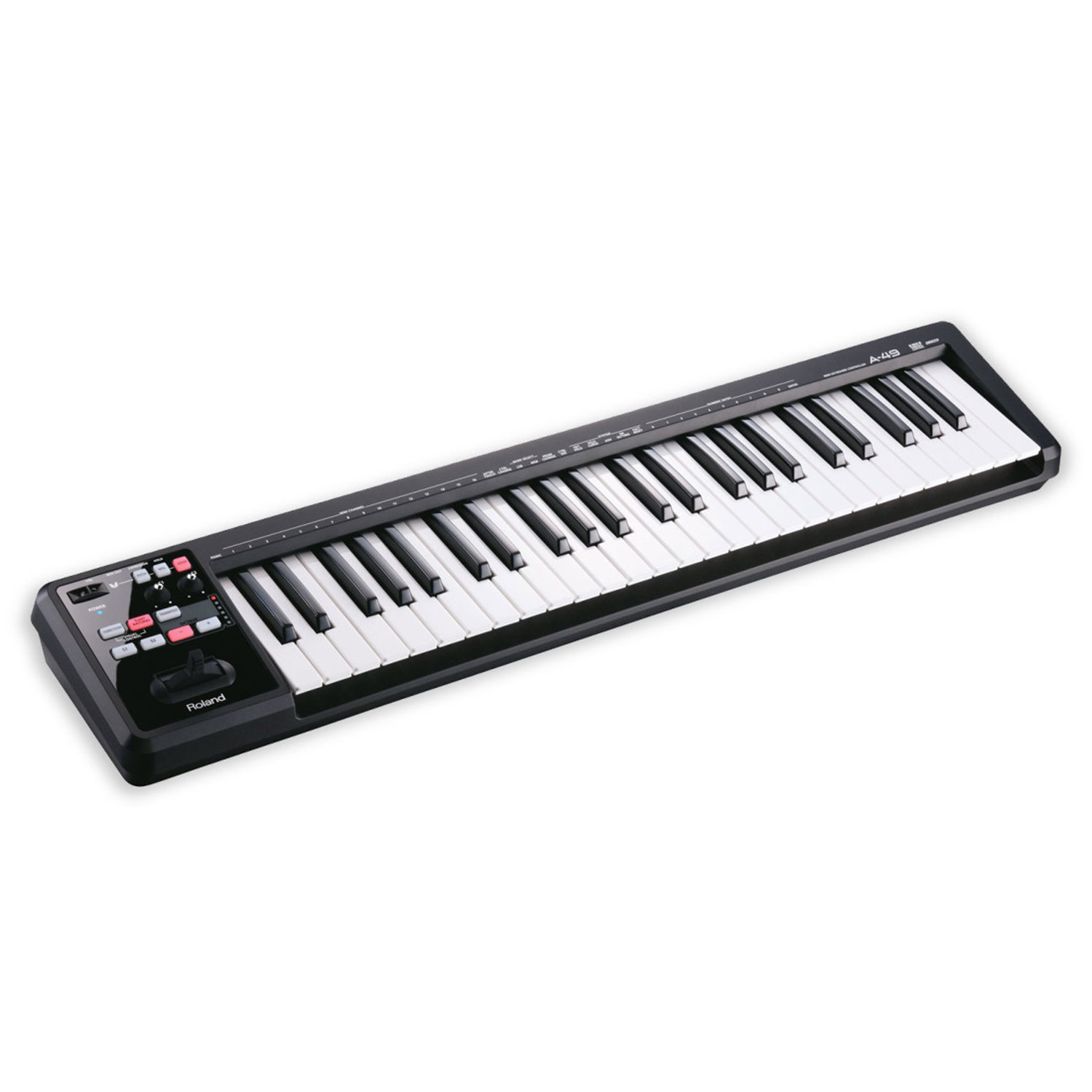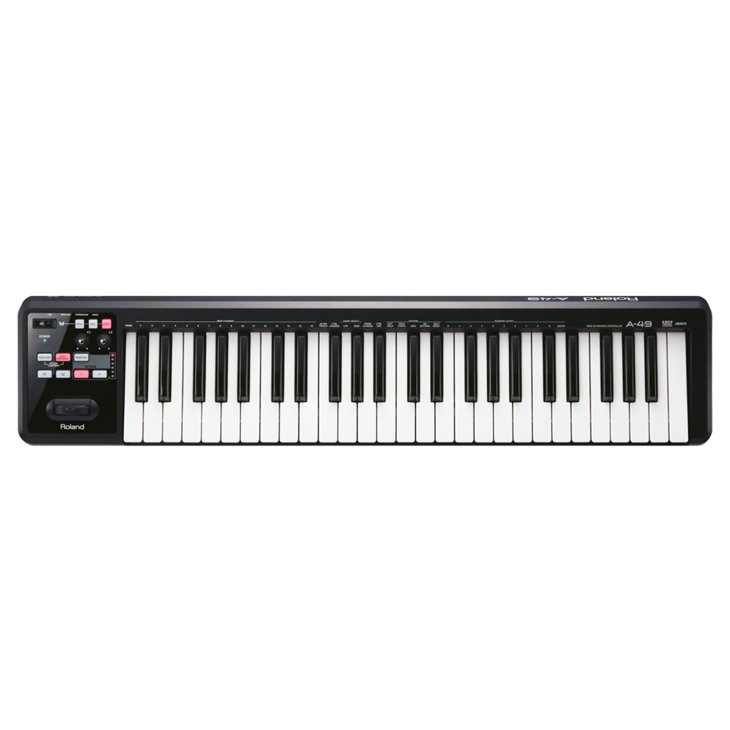 Das Roland A49 sticht gegenüber vergleichbaren MIDI-Controller-Keyboards durch seine hochwertige, geräuscharme Vollformat-Tastatur und sein ausgezeichnetes Spielgefühl heraus. Das leichte und kompakt designte Keyboard ist in seiner Bedienung schlicht und effektiv gehalten. Neben den 49 Vollformat-Tasten mit Anschlagdynamik stehen 2 Regler und Buttons für Pitch, Volume, Transpose und Visual Control-Button zur Verfügung.