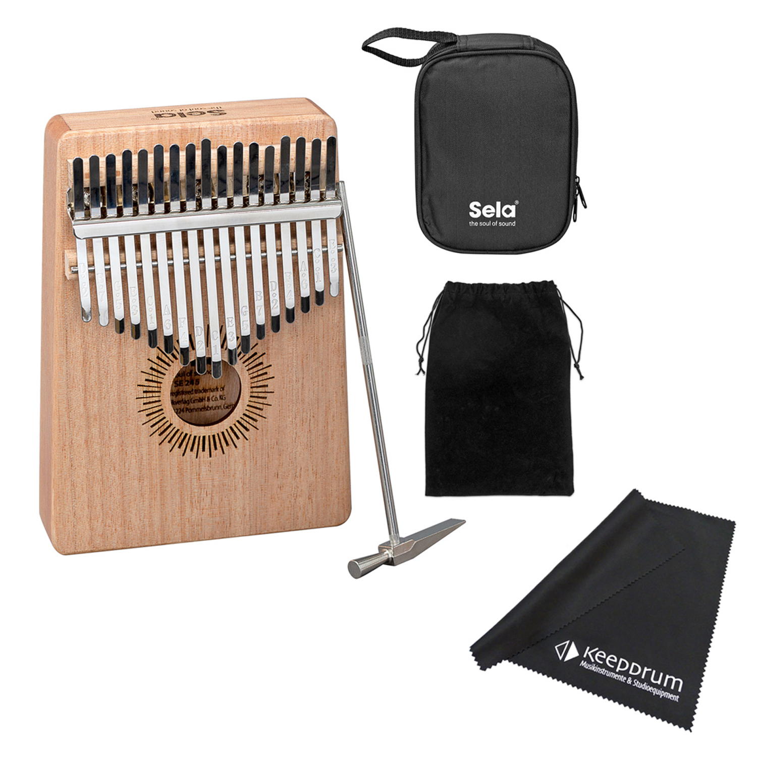 Im Lieferumfang ist eine gepolsterte Tragetsche mit Schlaufe enthalten, mit der die Kalimba sicher transportiert und aufbewahrt werden kann. Ebenfalls im Lieferumfang enthalten sind eine zusätzliche Stofftasche sowie ein Stimmhammer. + keepdrum Mikrofaser-Reinigungstuch:
