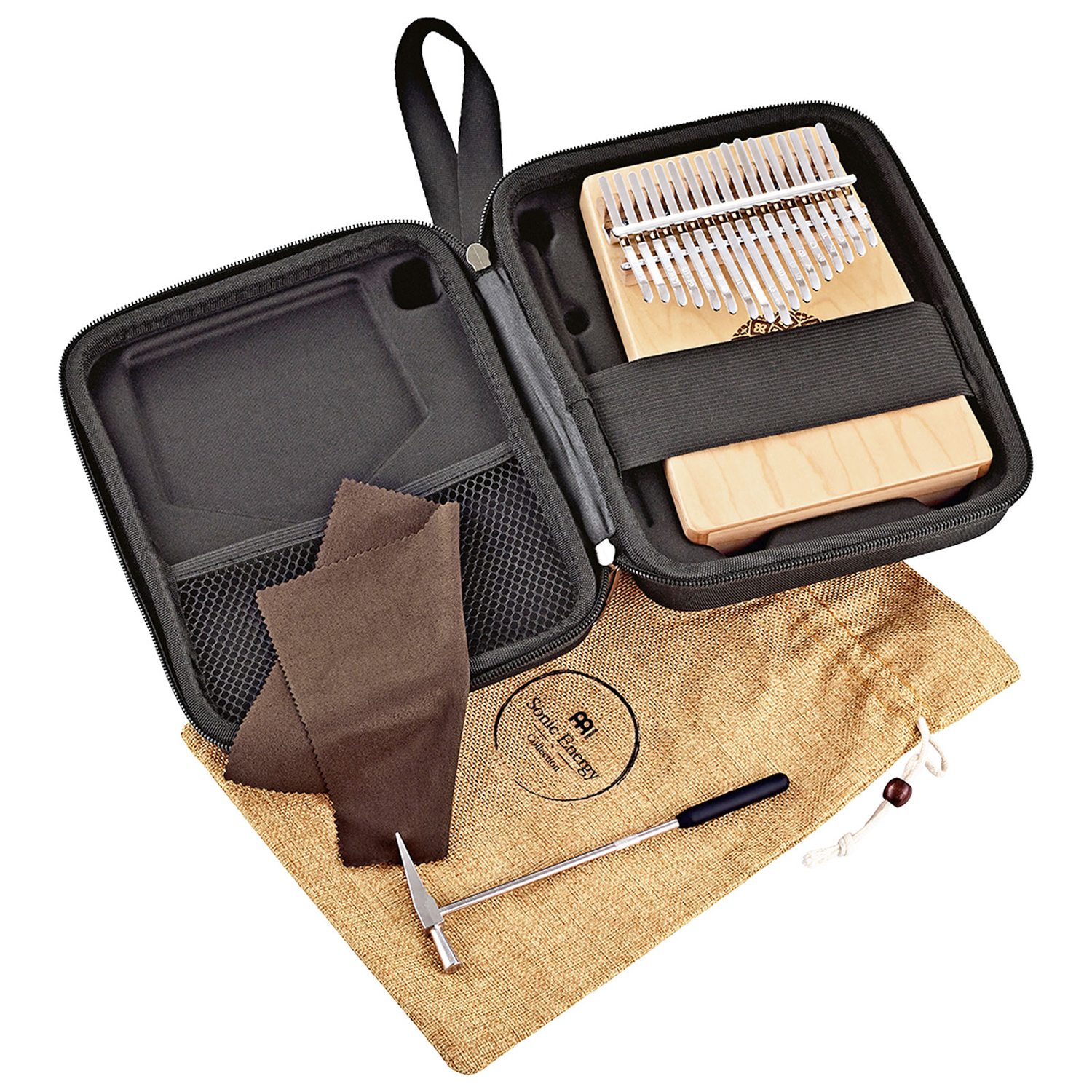 Mit im Lieferumfang sind ein Etui, das Schutz vor Kratzern bietet, ein Mikrofasertuch, um die Kalimba stets sauber zu halten sowie eine Baumwolltasche, um das gesamte Set zu transportieren. Zudem liegtein Stimmhammer bei, um die Kalimba bei Bedarf neu zu stimmen